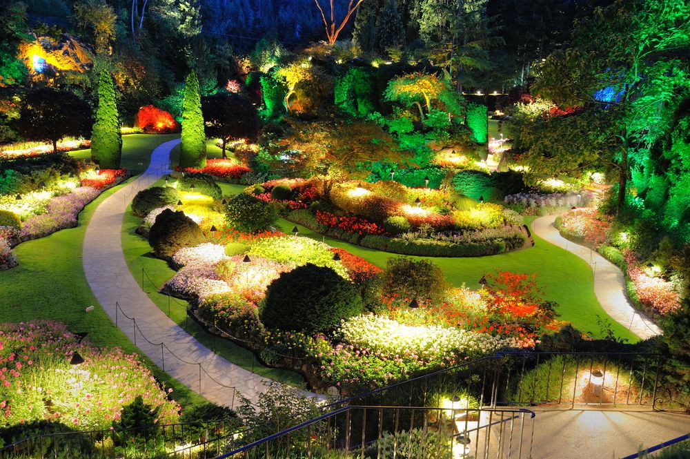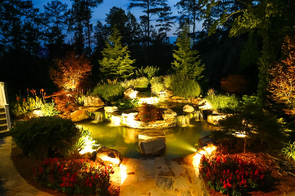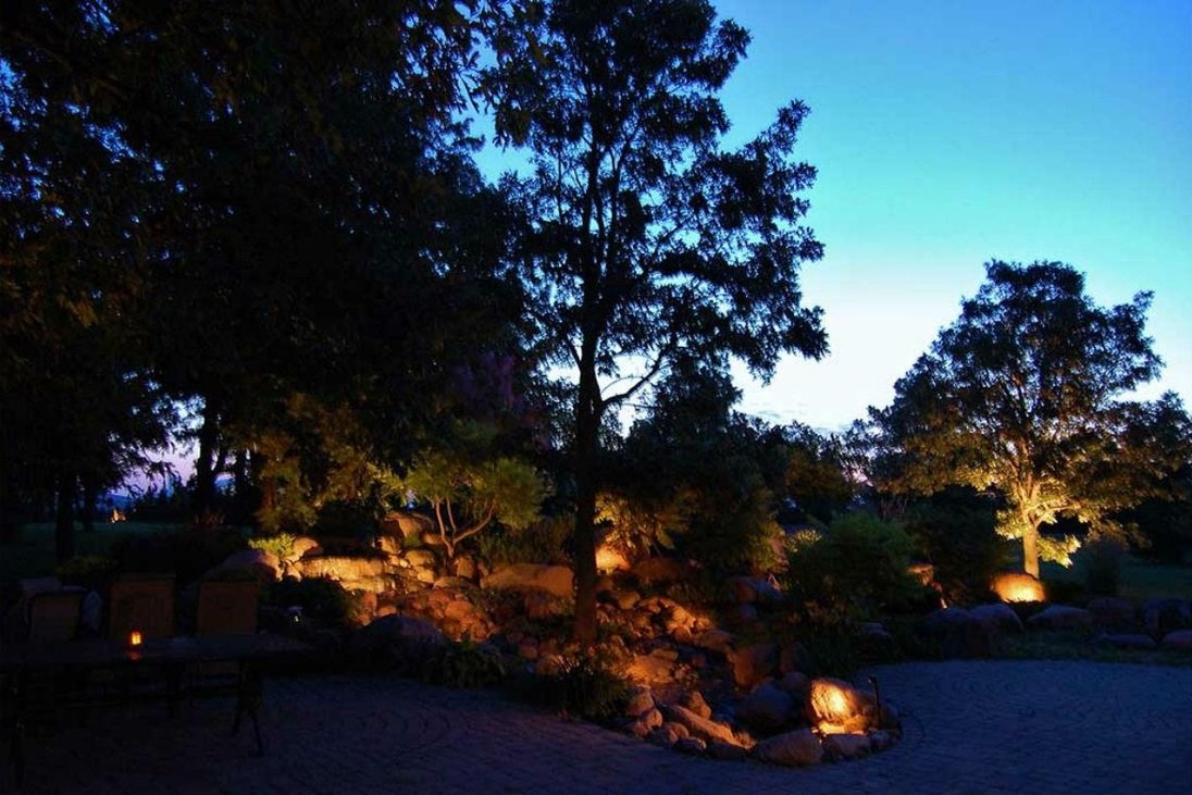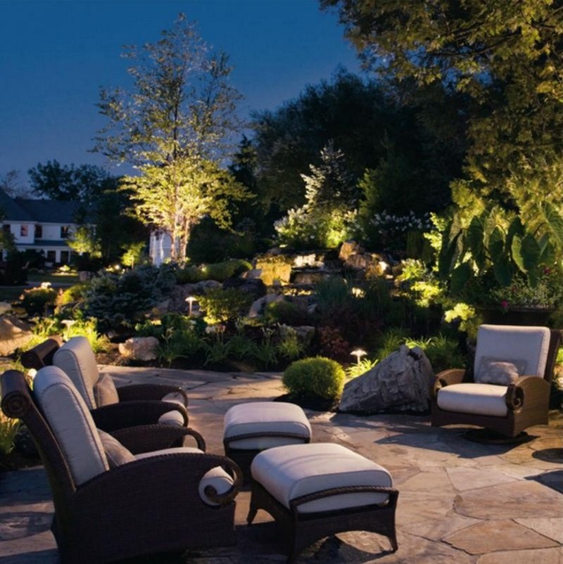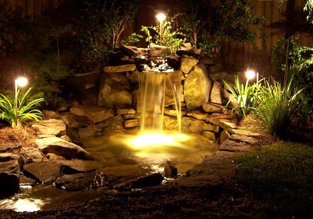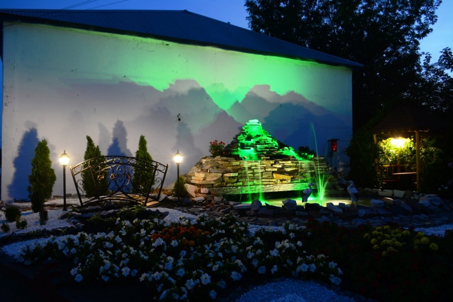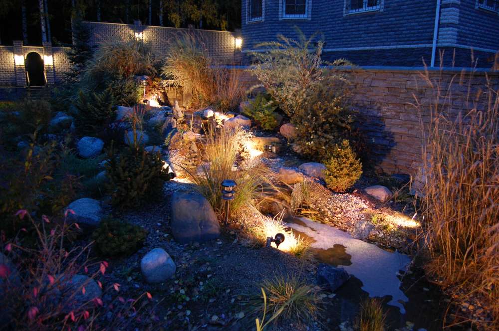 El jardín de rocas se ve espectacular por la noche, iluminado por mini focos o lámparas LED en las clavijas.Las lámparas con un amplio ángulo de dispersión iluminan los arbustos, las luces direccionales iluminan las flores, el follaje. La opción más fácil para la retroiluminación son las luces solares. La falta de cable da libertad de acción, los dispositivos de iluminación se pueden instalar en cada nivel, resaltar un estanque, terrazas. Las lámparas de suelo pueden delinear el contorno del área pintoresca o resaltar arbustos. La iluminación subacuática con lámparas de diferentes colores aumenta visualmente el volumen, colorea el agua. Los globos flotantes con energía solar se mueven libremente alrededor del estanque.