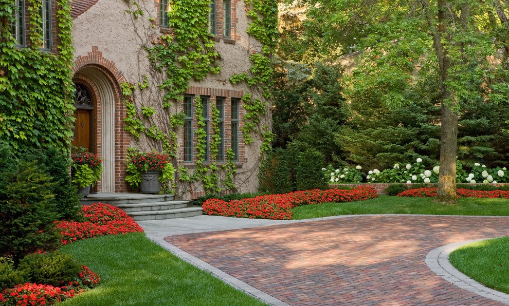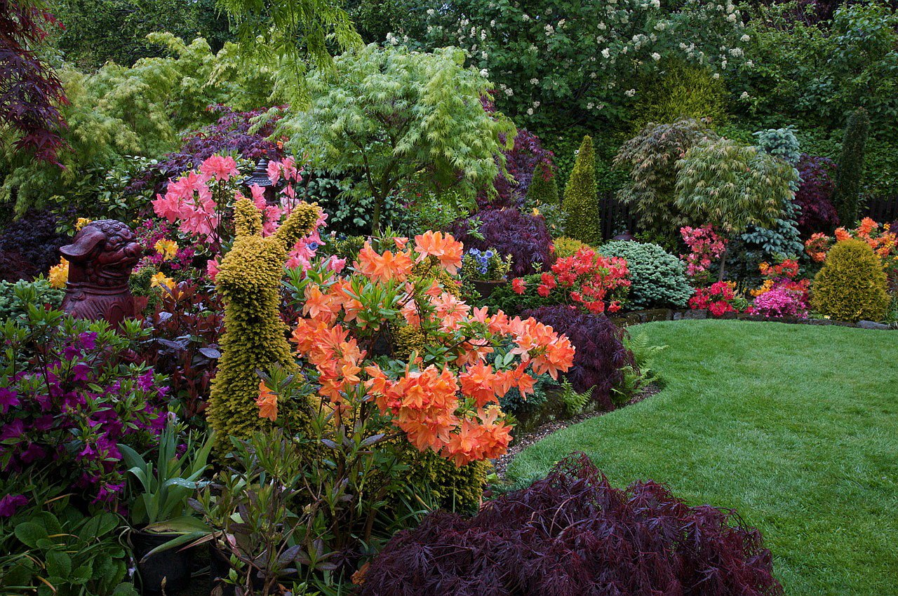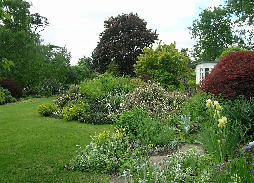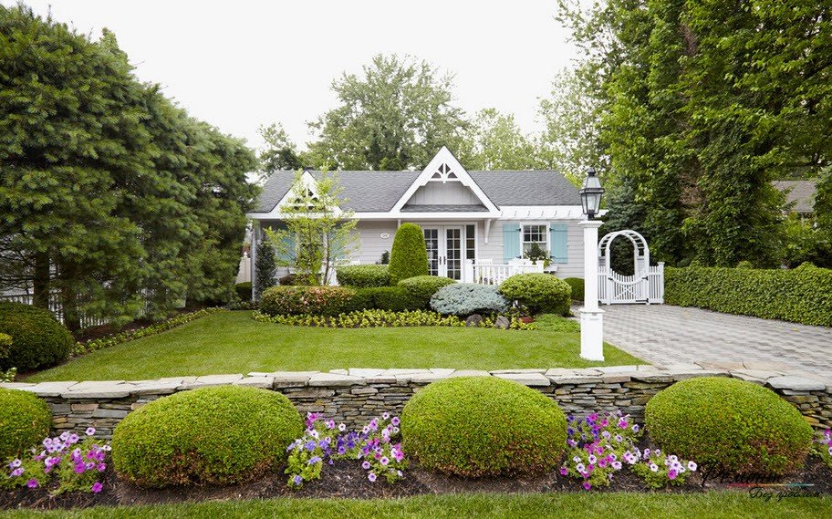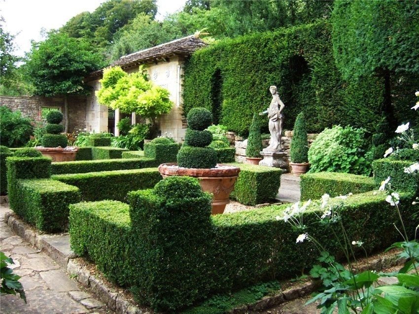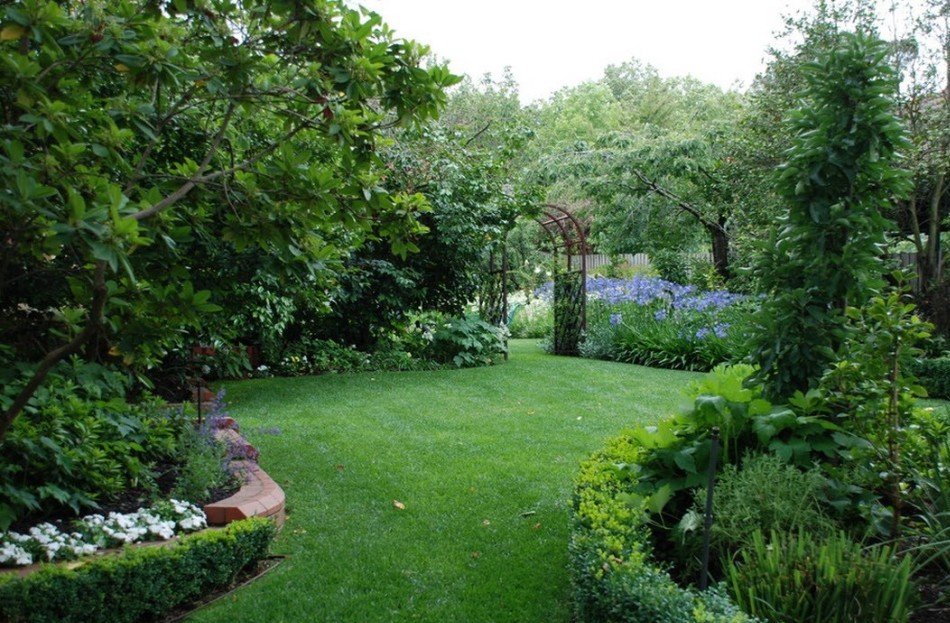 El jardín inglés es menos parecido a la paleta de colores del artista de vanguardia. Se caracteriza por una abundancia de verde. Además, se utilizan sus numerosas gradaciones: plata, ensalada, menta, malaquita, primavera, mostaza, bosque, oliva, viridian, chartreuse, clásico. Puede lograr tal variedad de tinte combinando varios árboles y arbustos. Hablaremos sobre qué tipos de plantas se plantan en los jardines ingleses a continuación. Por supuesto, la alfombra verde está diluida con puntos brillantes, pero principalmente dan vida al exterior del edificio principal. Es aquí donde hay macizos de flores uniformes, geométricamente regulares. Mientras que los macizos de flores en el resto de la parcela están hechos principalmente en colores pastel tranquilos: rosa delicado, melocotón suave, granate, lila puro, amarillo pálido, blanco.