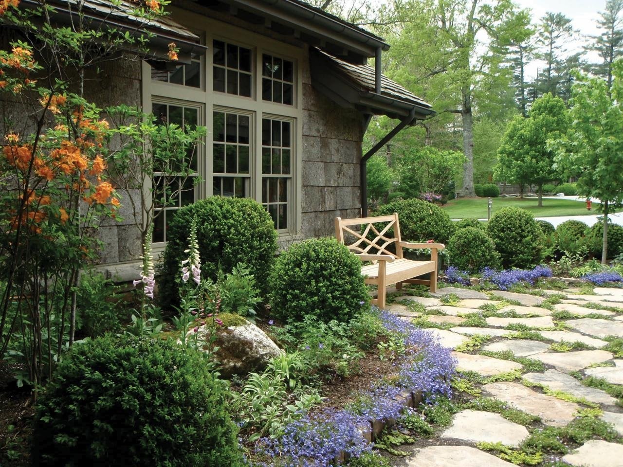 El exterior de la casa está incluido en la composición general y es una parte integral de la misma. La fachada debe ser ajardinada con la ayuda de plantas de tejido (hiedra, clemátide, uva). En las antiguas fincas inglesas, las paredes de la casa no son visibles en absoluto detrás de la cortina verde.