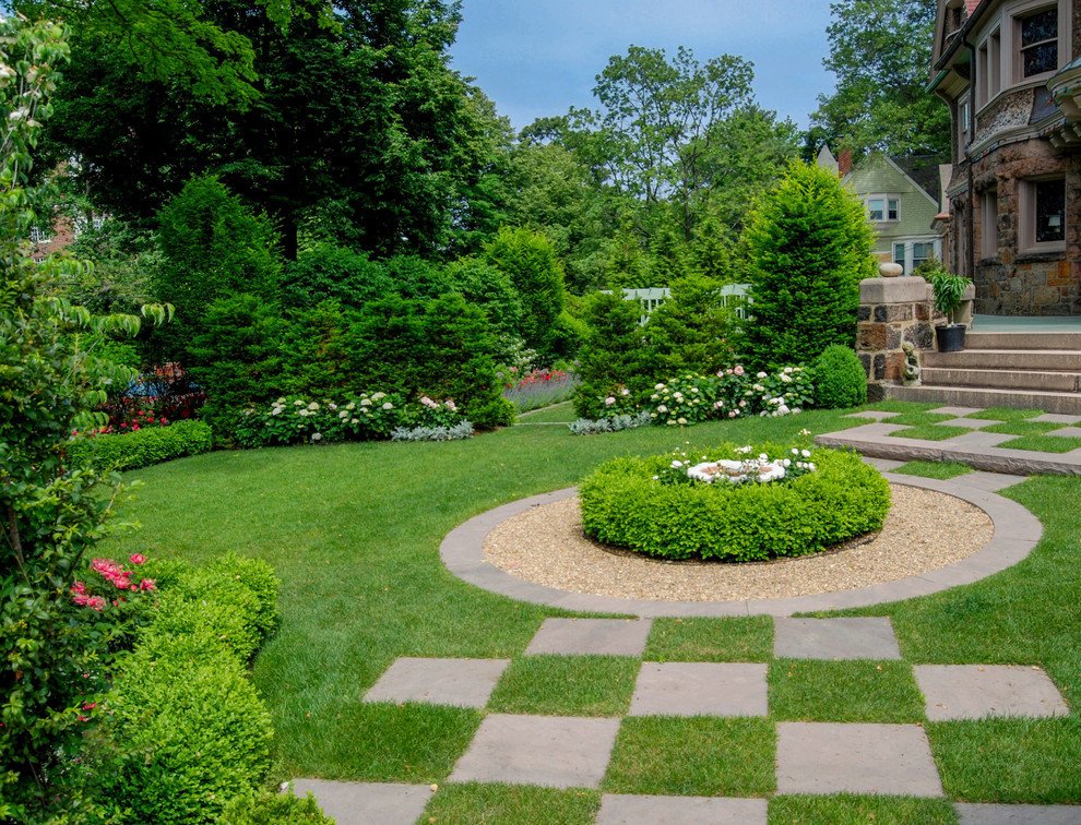 Varios céspedes grandes que están interconectados por senderos de jardín.