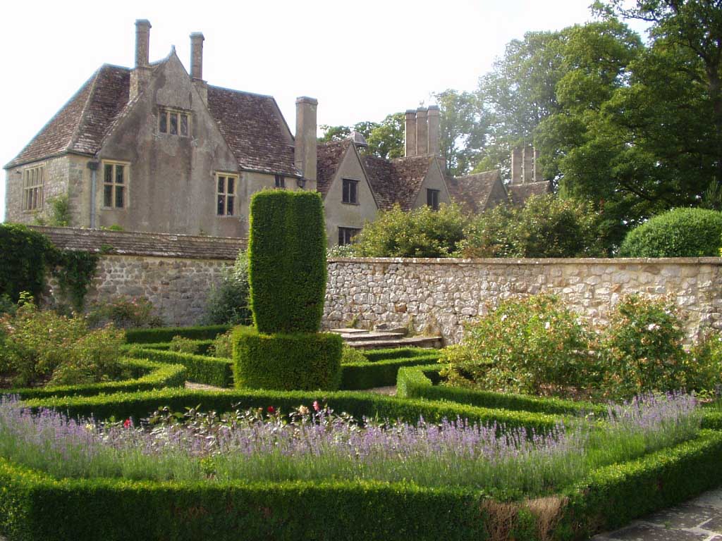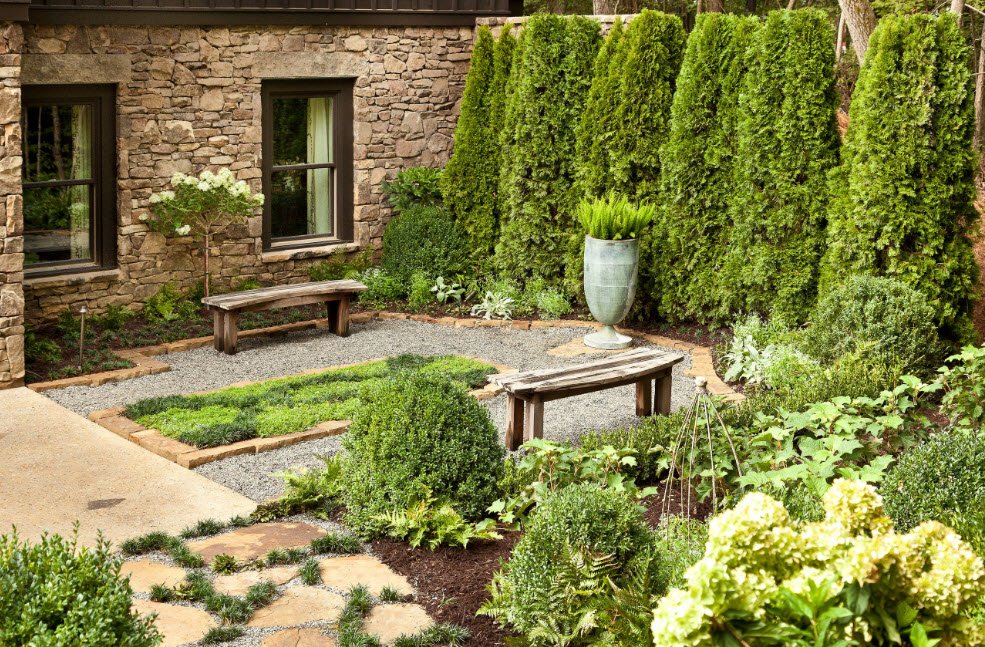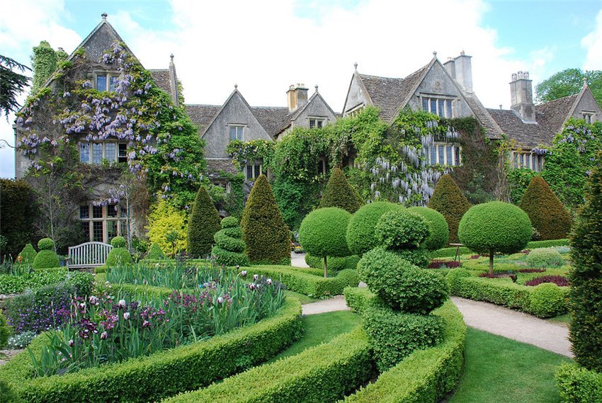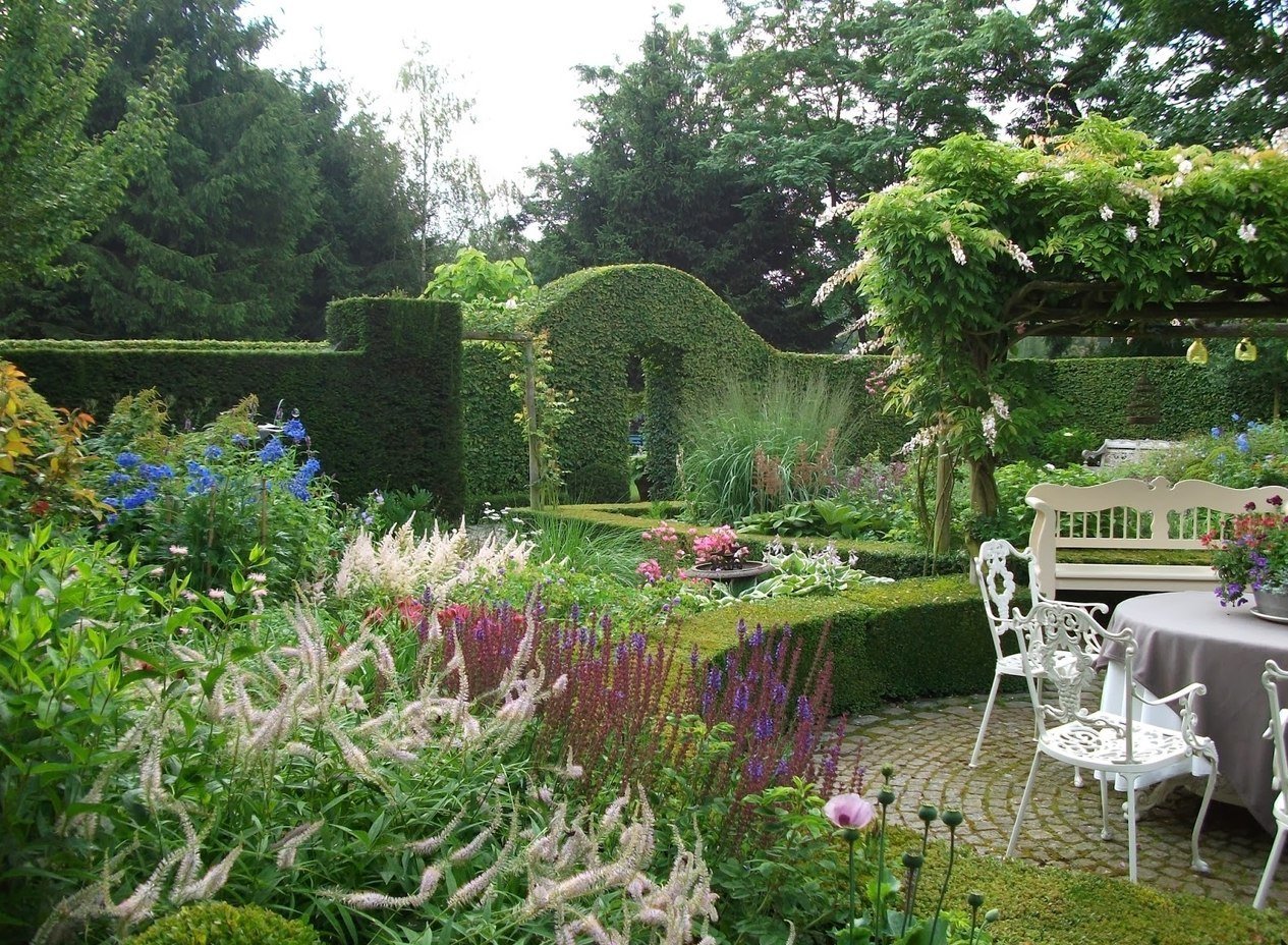 El lúpulo, la clemátide, la hiedra y las uvas de niña se convertirán en el fondo verde en el que se encuentran los macizos de flores y los jardines de rocas. Las plantas que tejen literalmente marchitan las paredes no solo del edificio principal, sino también de los edificios adyacentes. En los jardines ingleses, las especias florecen salvajemente. De la variedad, elija estragón, laurel, cúrcuma, azafrán, albahaca, romero, ajo silvestre, dientes, cilantro y chirivía. El borde de los estanques está decorado con traje de baño, espadaña, kaluga, nomeolvides, lirios y juncias. Entre los árboles, se da preferencia al castaño, fresno de montaña, alerce, abedul, roble, tuya y avellano (avellano).