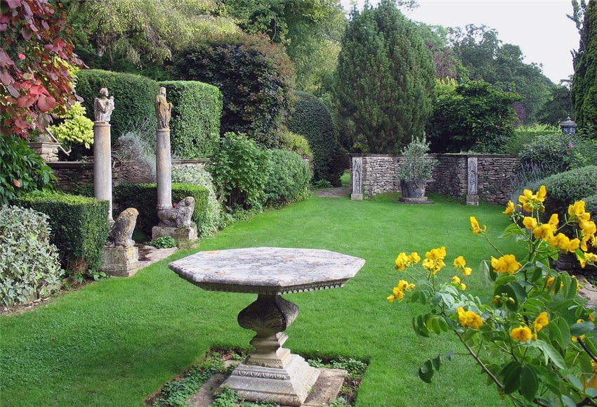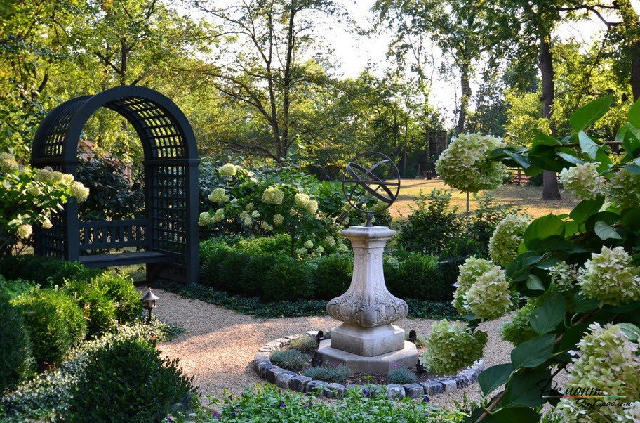 En los parques y jardines de infancia ingleses se utiliza poca decoración hecha por el hombre.Sin embargo, esas decoraciones que todavía están presentes en el paisaje se convierten automáticamente en zonas de acento, precisamente porque son minoritarias y pierden en gran medida el número de espacios verdes. La ubicación de los detalles decorativos importantes debe pensarse de antemano. El diseñador está armado con una hoja de papel para dibujar y un lápiz, dibujando un plano del sitio y luego dibujando edificios ya existentes en el dibujo. Ahora que es más fácil navegar por el terreno, puede dibujar un diseño aproximado de la decoración. De una amplia gama de decoraciones de paisajes, solo se deben elegir detalles típicos ingleses o antiguos. Estos últimos se utilizan para diseñar rincones y grietas individuales.