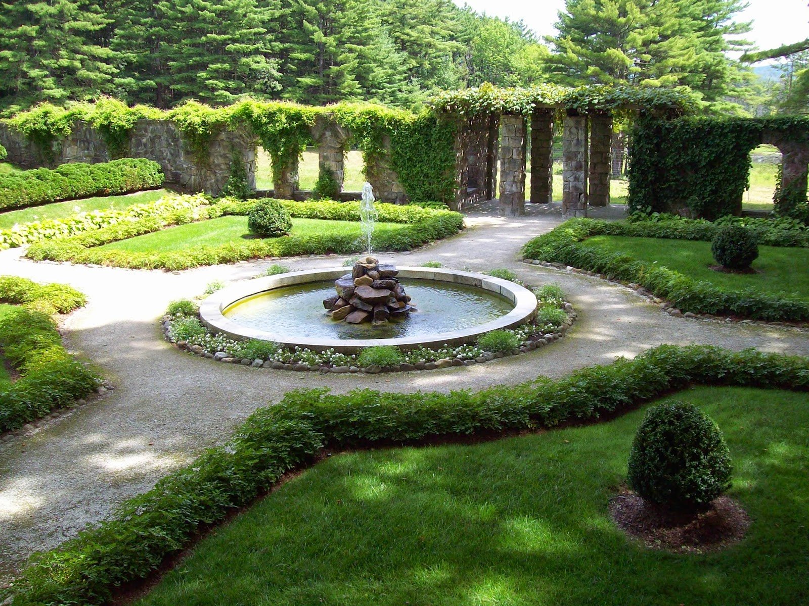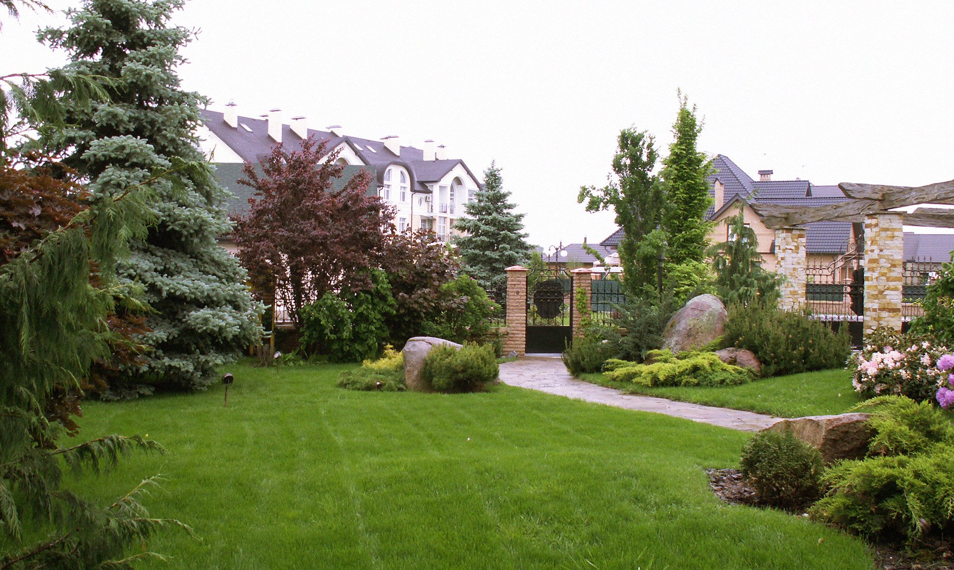 A pesar del paisaje natural, la ubicación de cada objeto está claramente verificada. Antes de la implementación del proyecto de diseño, el diseño de los estanques, céspedes, cenadores se ajusta cuidadosamente. El edificio principal está necesariamente ubicado en la parte posterior de la parcela, la fachada está oculta a los ojos de los transeúntes con coronas de árboles. Las pérgolas se colocan en las intersecciones de los senderos del jardín. Brillantes y coloridos macizos de flores adornan solo el patio frente a la casa. Se muestran composiciones escultóricas, es recomendable colocarlas cerca de la valla. Los espacios verdes se encuentran alrededor del perímetro del sitio.