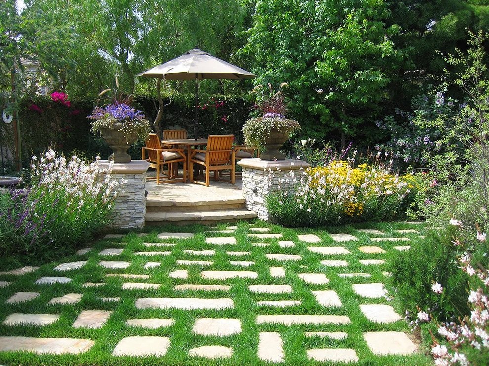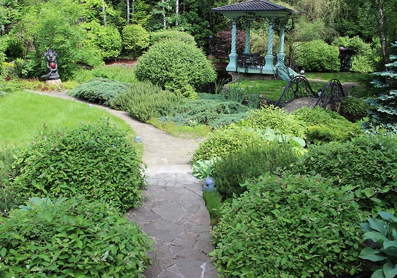 Sinuosos senderos del jardín. Al diseñar, primero en el plano coloque los objetos del paisaje y solo después de eso, piensen en la ubicación de las líneas de comunicación. Los caminos rodean obstáculos y se menean en estanques, cenadores o espacios verdes. Están hechos de piedra o materiales a granel: arena, grava, piedra triturada, guijarros, corteza de madera.