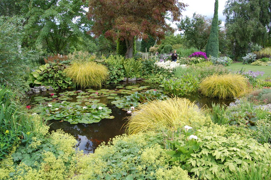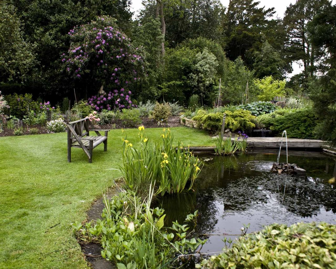 Los estanques al estilo inglés tienen una forma irregular que imita la forma natural. Una playa apacible está decorada con plantas. En el centro del estanque coloque una pequeña fuente o escultura. La superficie del agua está decorada con nenúfares, lirios, lentejas de agua. Si las dimensiones del depósito lo permiten, entonces se lanza un puente con rieles forjados a través de su centro. Se deben colocar uno o dos bancos cerca del agua. Parcialmente, la playa está decorada con escalones de piedra, que pasan suavemente al jardín de rocas, con grandes adoquines.