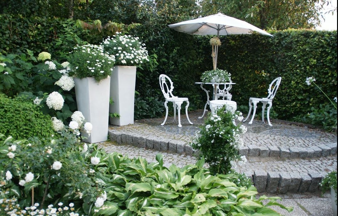 Arbustos de euonymus, césped, malvavisco, lila, saúco y jazmín se plantan alrededor del perímetro del sitio. Entre la diversidad de plantas perennes, la elección se detiene en rosas, phlox, ajenjo común, cebollas gigantes, helechos, incienso, ruibarbo, captación, huéspedes, rogers. La cabaña del jardín utiliza espireas, margaritas, azafranes, galantos, lirios del valle, helenios, delfines, peonías, onagra, asteres. De los jardines de flores, se da preferencia a mixborders ligeramente desordenados. Cerca de la casa se colocan bonitas camas de flores individuales en jarrones de piedra, cuencos con patas altas y delgadas.
