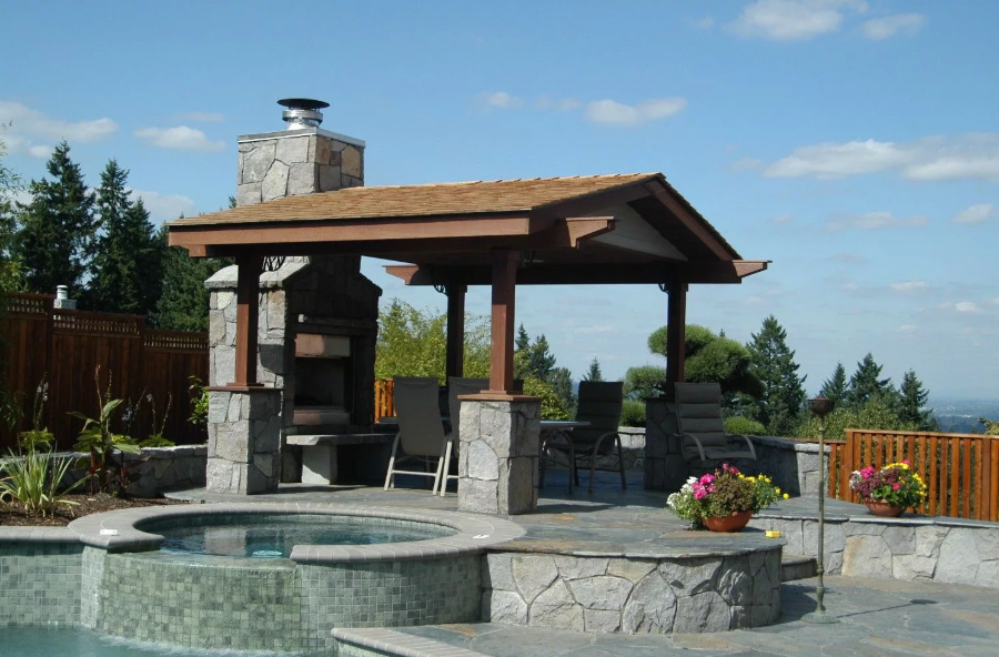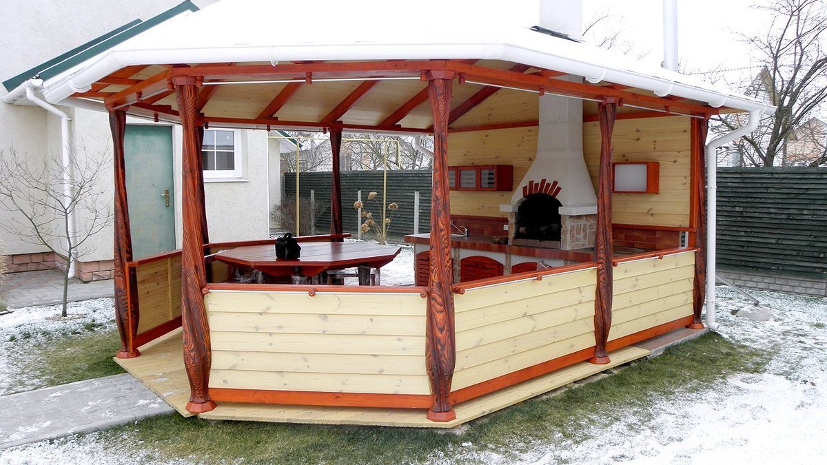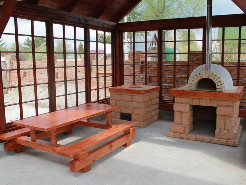 Una idea interesante para los propietarios de terrenos y casas de campo. Pero su implementación será bastante costosa, requerirá un edificio capital con una base sólida y chimenea. Para que la estufa de la chimenea realice sus funciones por completo, la glorieta exterior debe estar cerrada. Según el propósito, se construyen estructuras de los siguientes tipos: