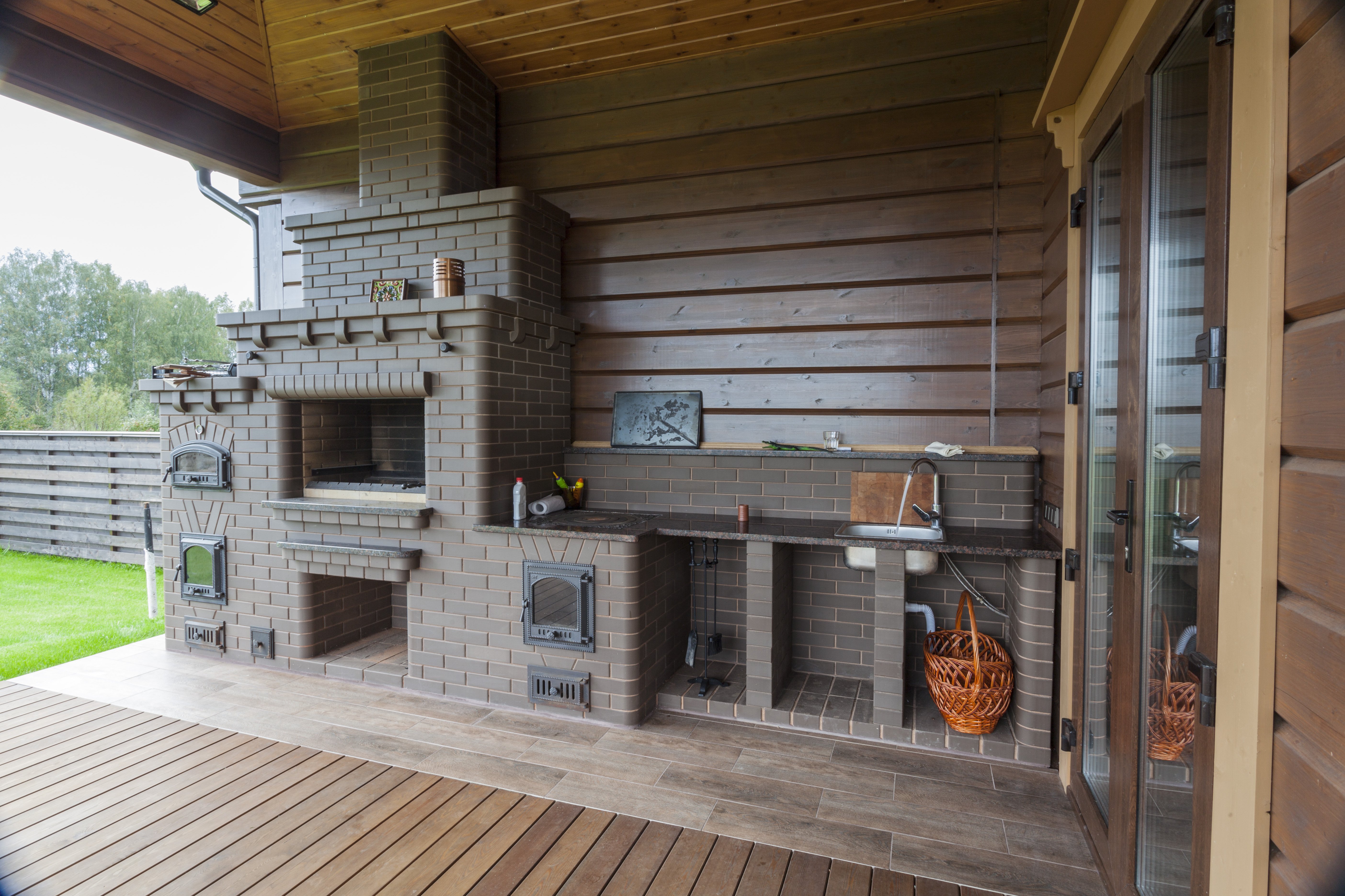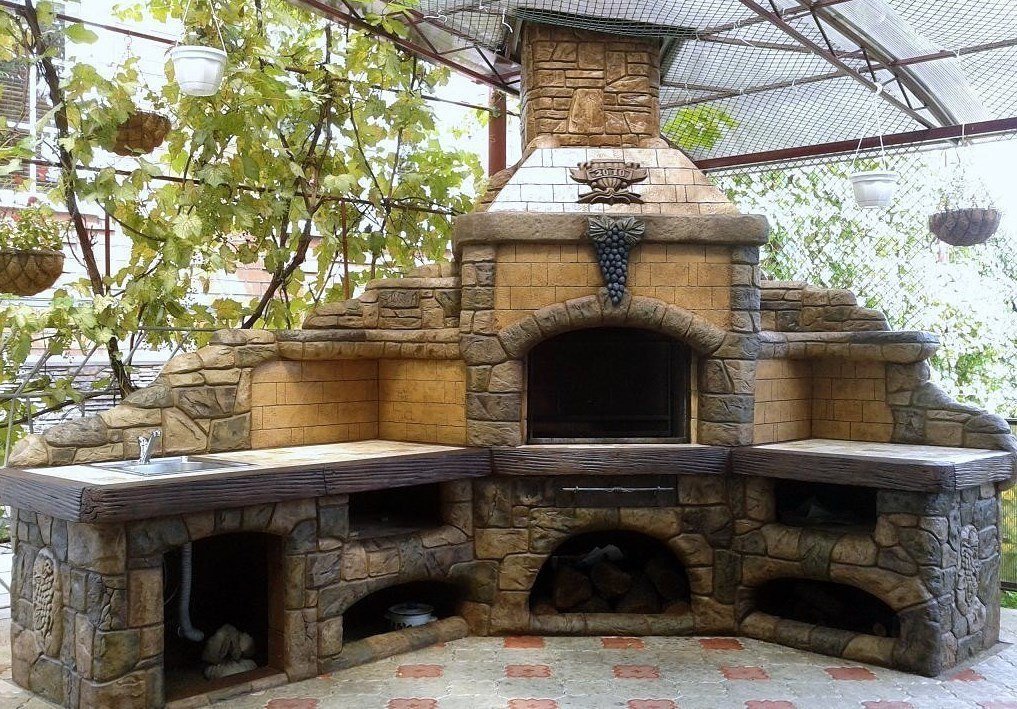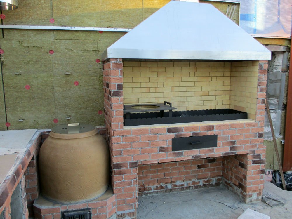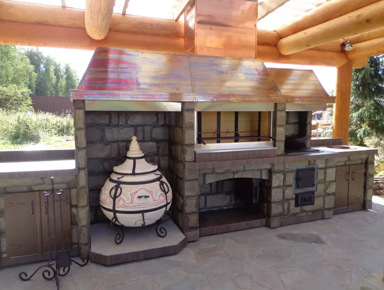 Para barbacoa y barbacoa, se asigna una sección separada. Más a menudo, este es un lugar entre la estufa rusa y el tandoor, para garantizar el diseño con una buena campana. Los complejos modernos de la calle están equipados con una estufa de gas, paneles de corte, lavavajillas.