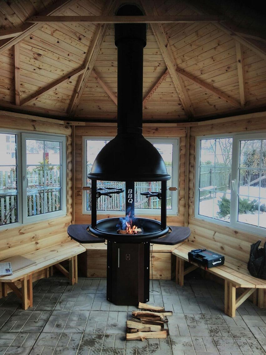 Usar una estufa de barbacoa en las piernas es mucho más conveniente que una barbacoa. Las desventajas incluyen la complejidad del cuidado de las rejillas, la necesidad de una limpieza regular. El modelo compacto portátil tiene una forma redonda, a menudo instalada en el centro de la glorieta. Para mantener la descomposición del carbón, se complementa con una campana de escape con bisagras. El diseño también se puede mover fuera del edificio.