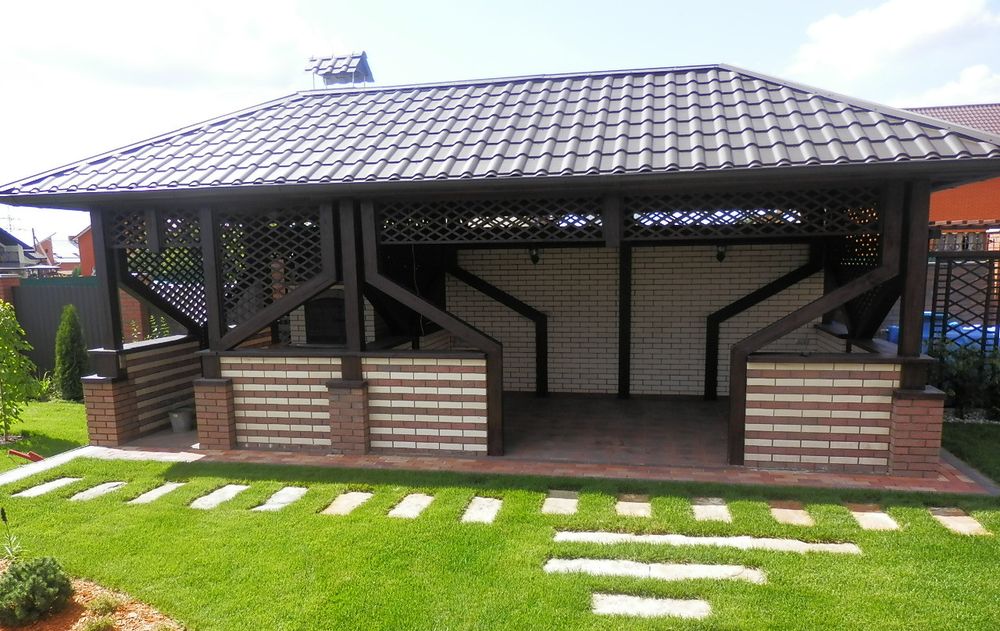 Ladrillo Una glorieta capital con una base ocupa mucho espacio, se verá ridícula en un área pequeña. Con una construcción adecuada, la construcción durará más de una docena de años.