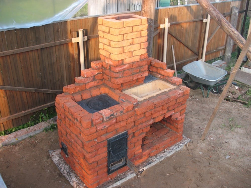 Una estufa de barbacoa más compleja está hecha de ladrillo. Extienda una base especial que lo eleva a la altura deseada.Se colocan una bandeja de metal y una rejilla en la cámara de trabajo. La chimenea está hecha de un tubo corto ordinario.