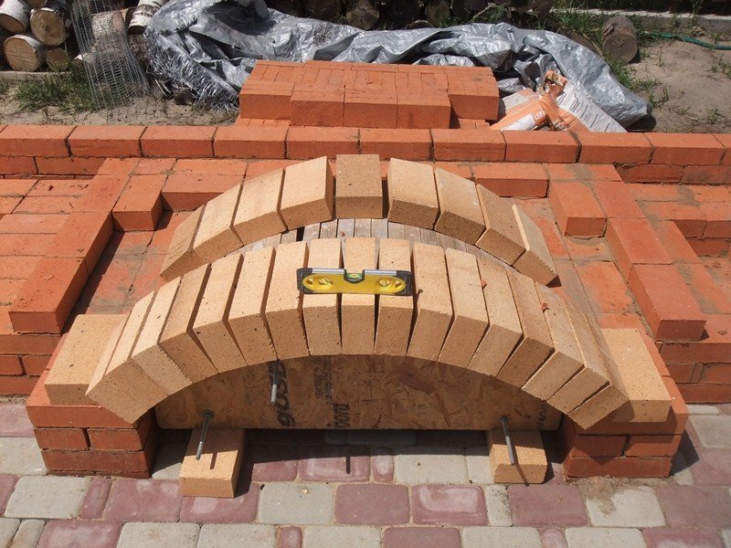 Debido a la complejidad de la instalación en los cenadores, a menudo se hacen mini diseños que parecen una barbacoa o una barbacoa. La cámara del horno está hecha de forma semicircular para una semejanza máxima con la estufa rusa. Debajo deja espacio para el leñador. En un nicho especial, no solo puedes freír la carne a fuego abierto, sino también cocinar los primeros platos, guisar verduras y hornear.