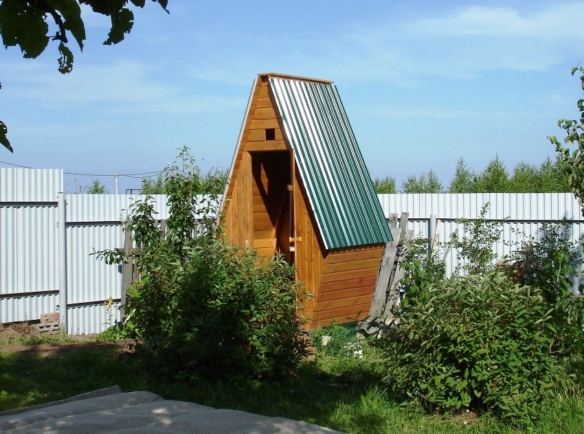 Pajarera. Un modelo de aldea simple tiene un techo inclinado, lo que reduce su costo, pero al mismo tiempo lo hace temblar y ser arrastrado por los vientos. Más adecuado para la versión de verano. En el techo puede colocar un barril de agua;