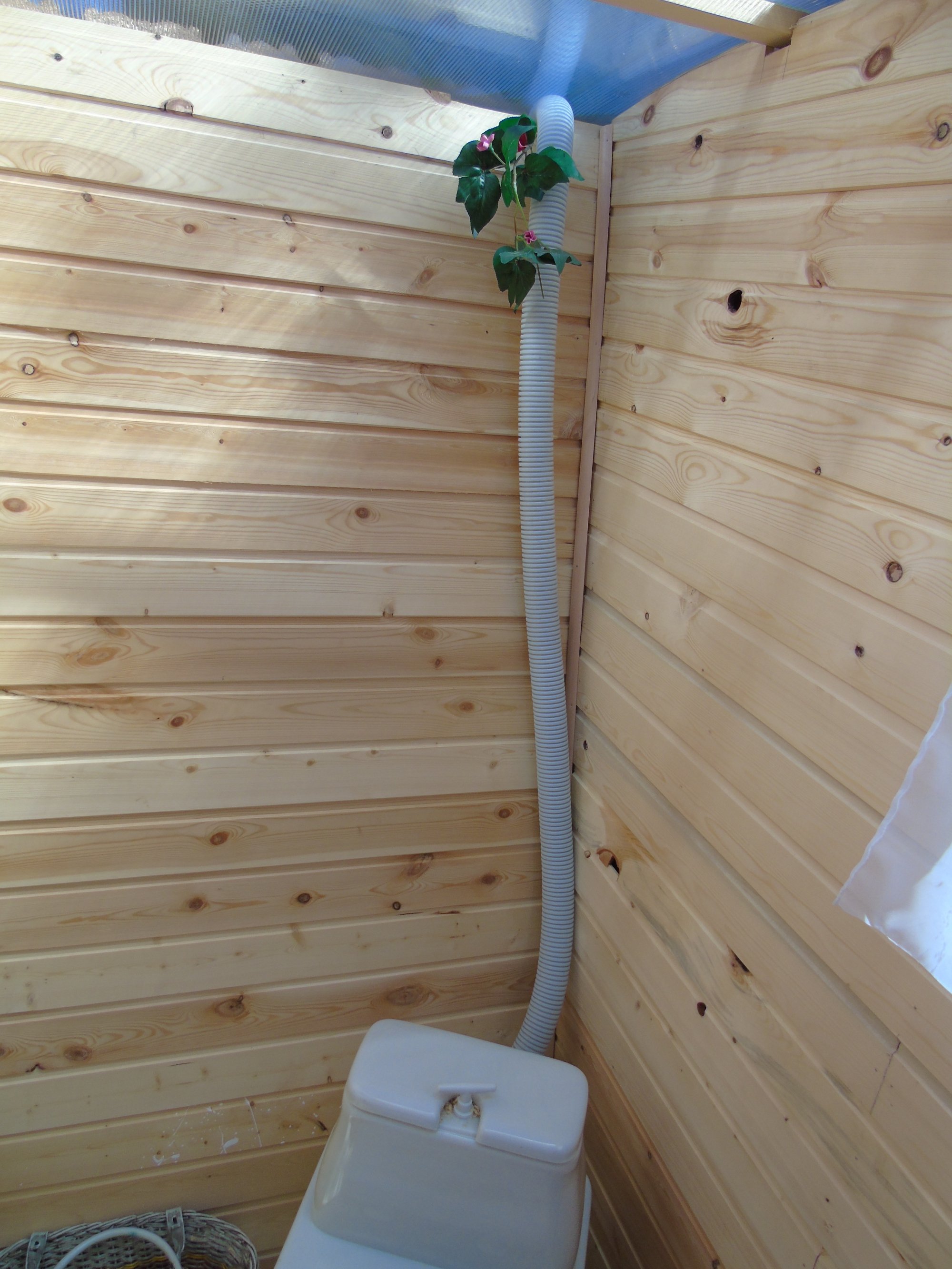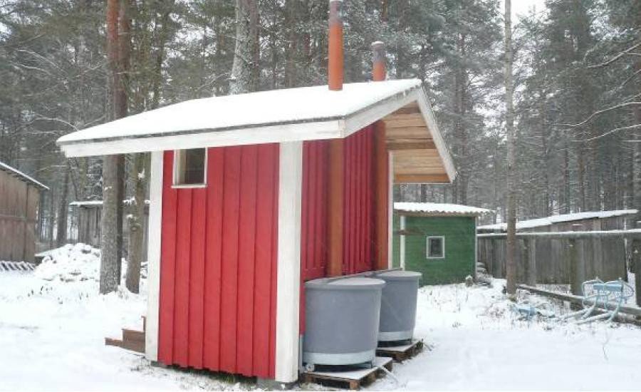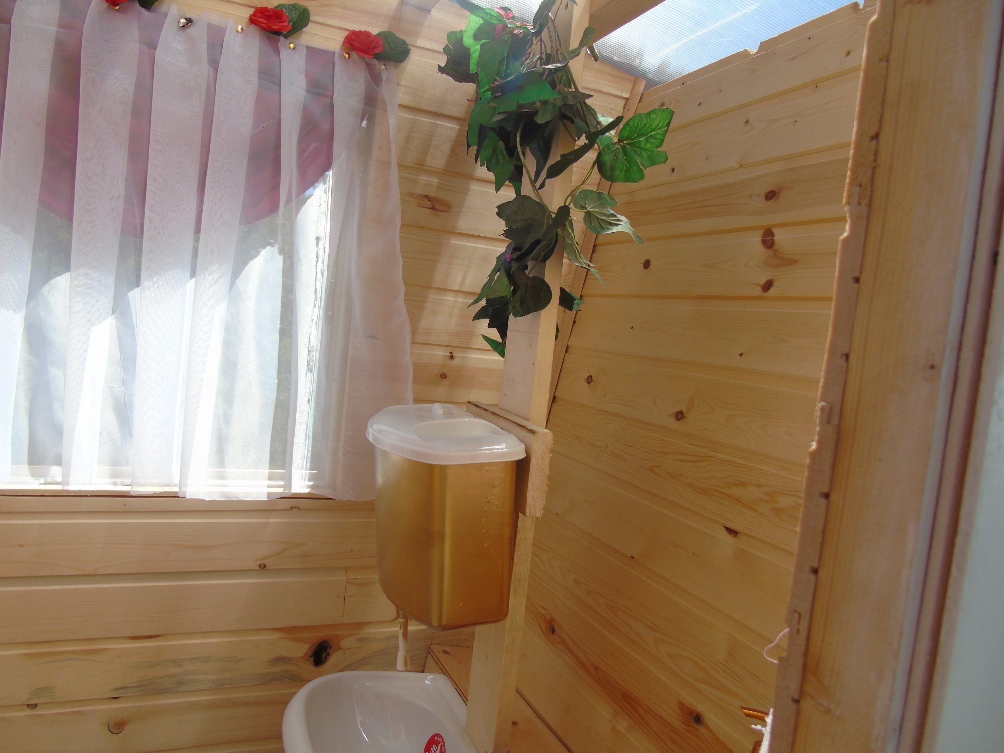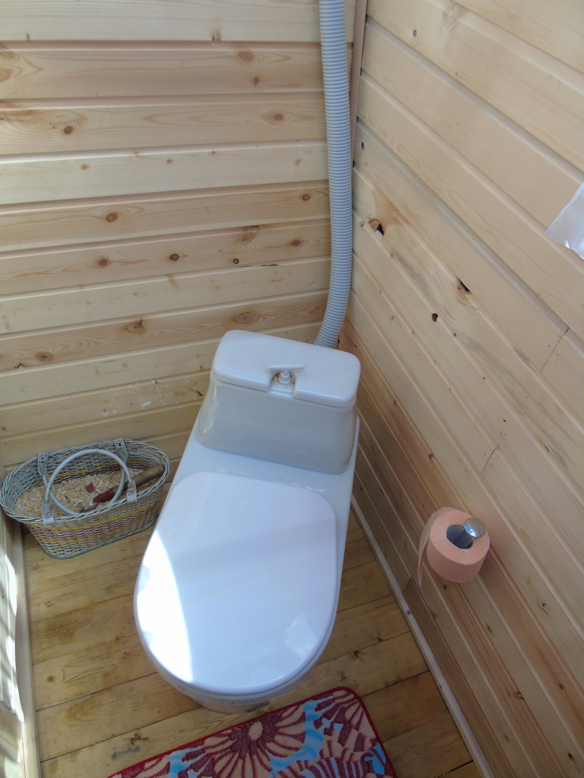 El amplio baño exterior se puede equipar con un tanque de drenaje y un lavabo. En este caso, el drenaje también está unido al pozo negro. Es posible organizar un sistema de alcantarillado con tuberías de PVC.