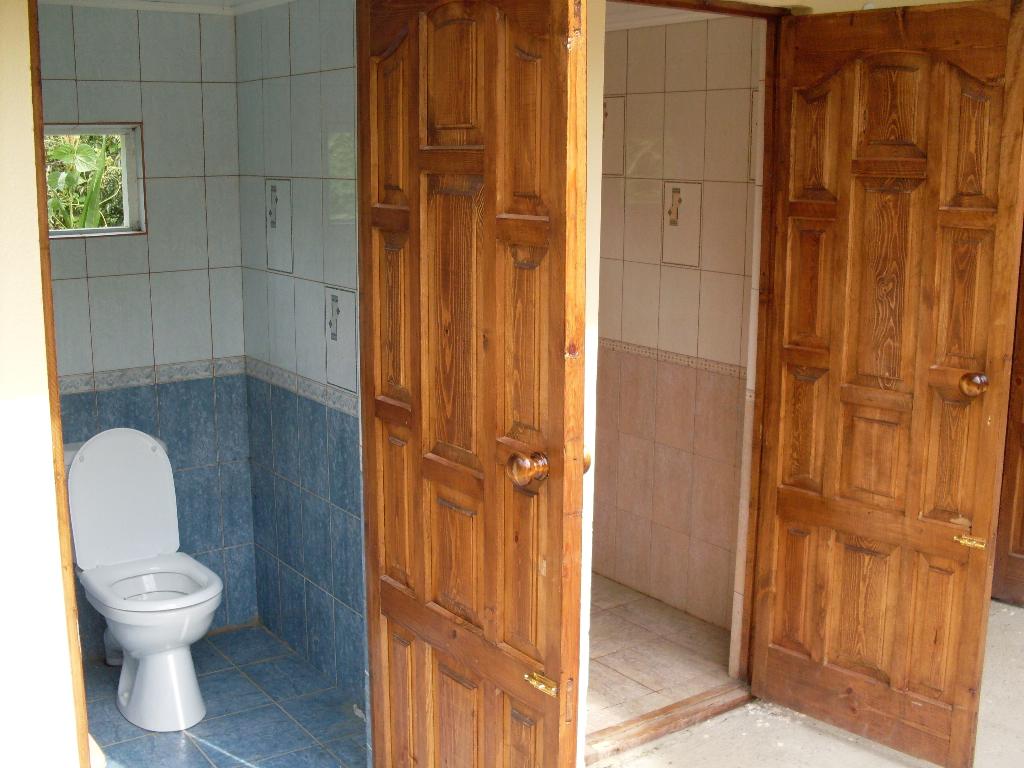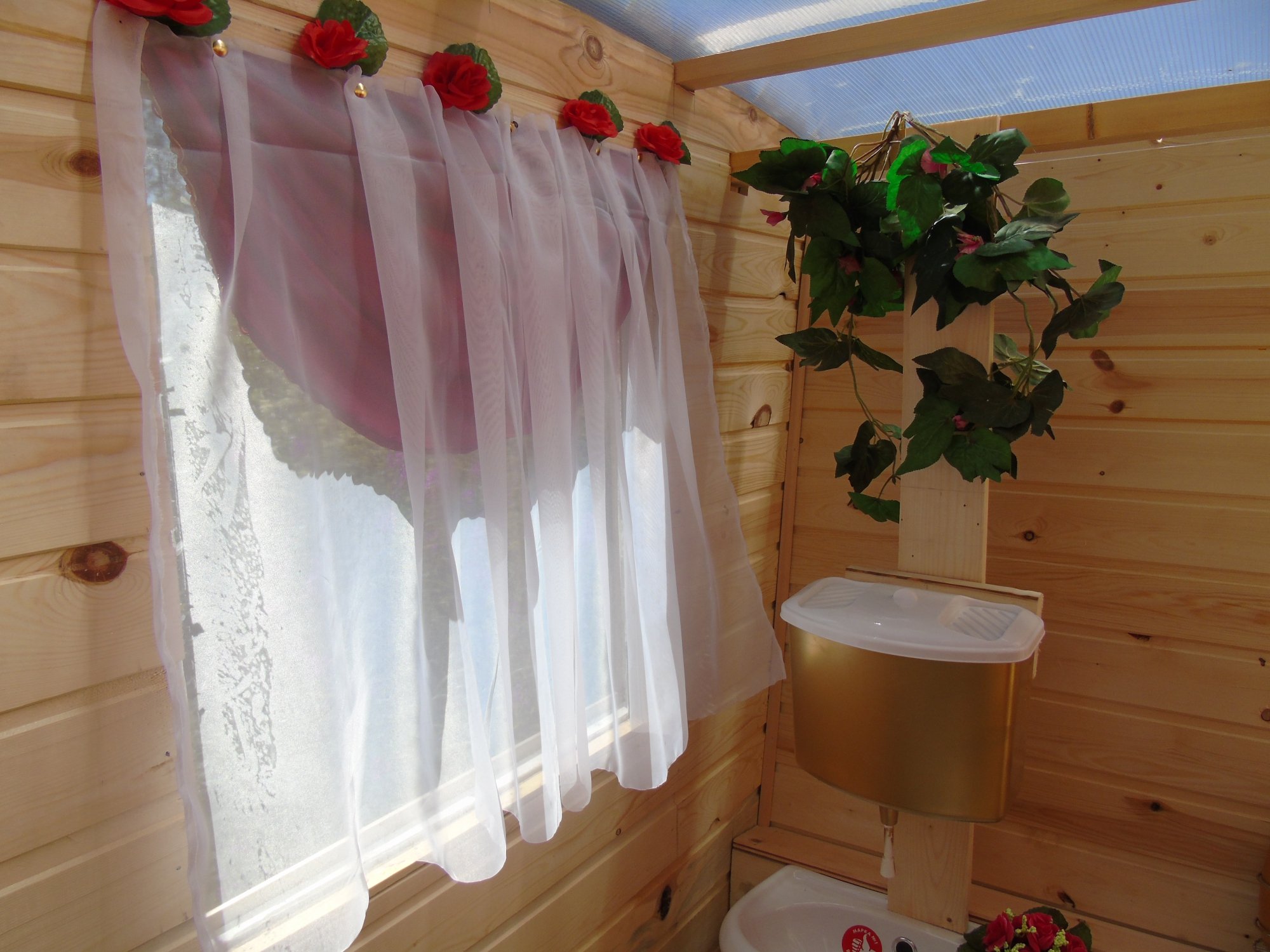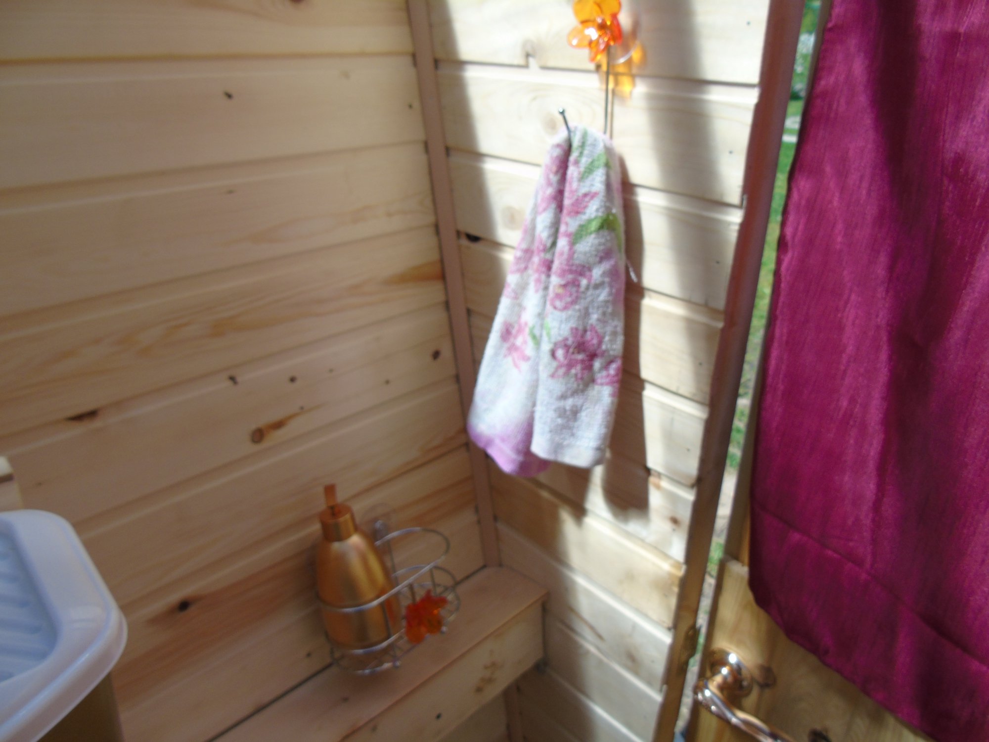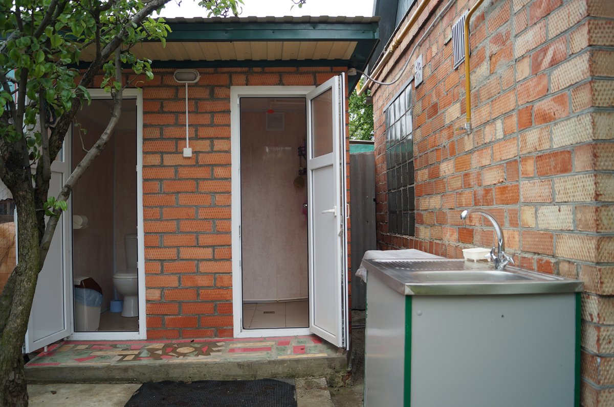 El amplio baño exterior se puede equipar con un tanque de drenaje y un lavabo. En este caso, el drenaje también está unido al pozo negro. Es posible organizar un sistema de alcantarillado con tuberías de PVC.