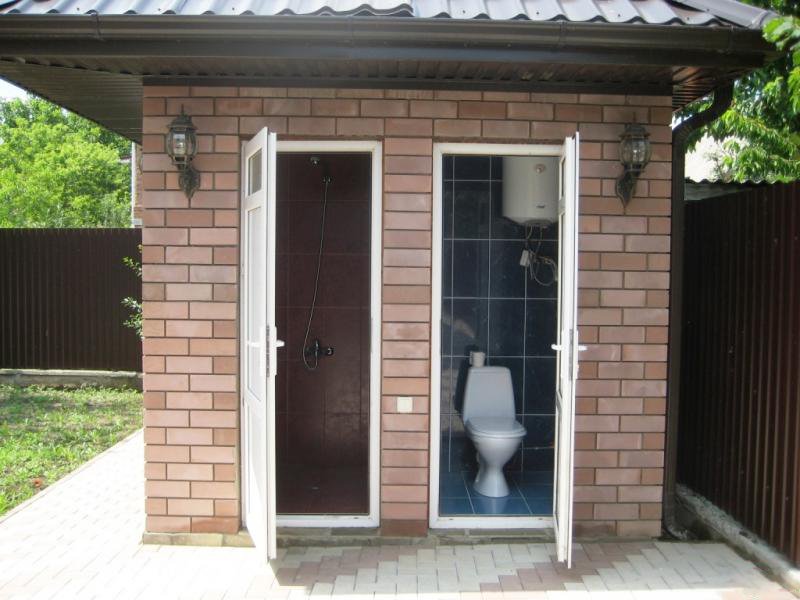 WC con ducha. La casa de verano combinada se complementa con una ducha de verano. Este tipo de construcción es rentable desde un punto de vista financiero, ahorra significativamente espacio. Las habitaciones tienen paredes y techos comunes.