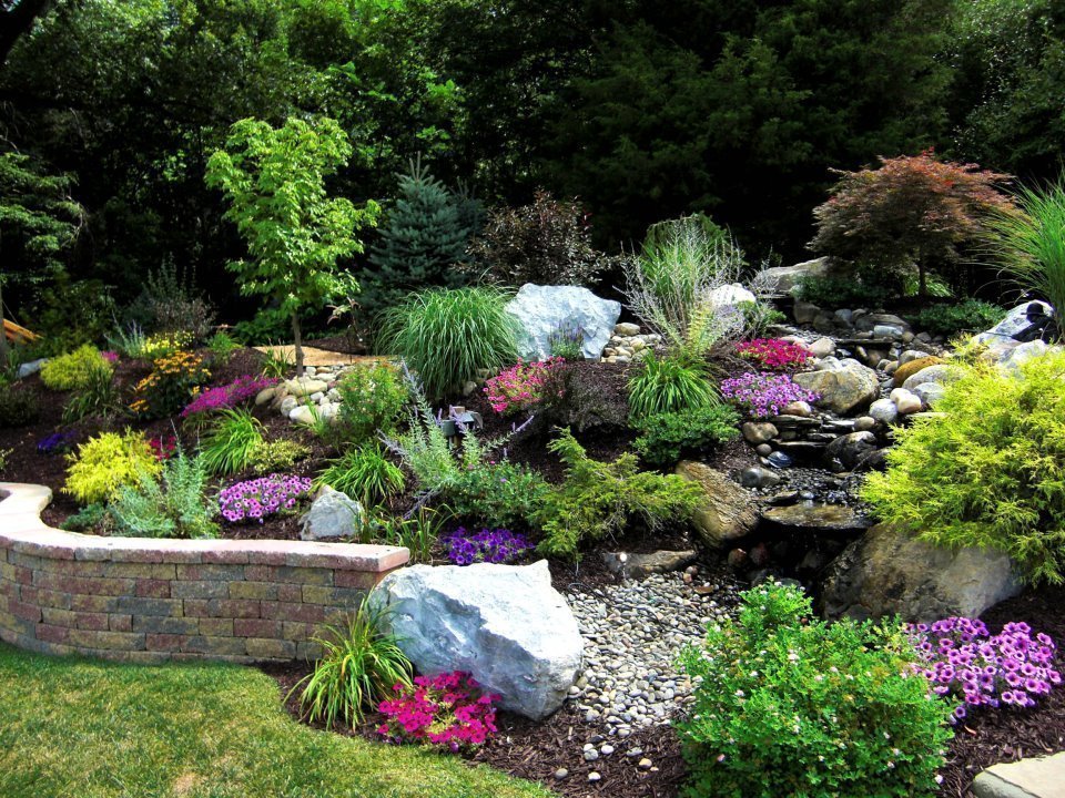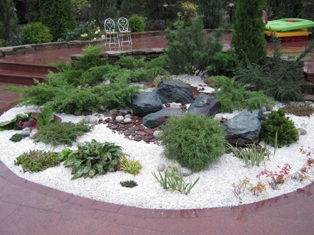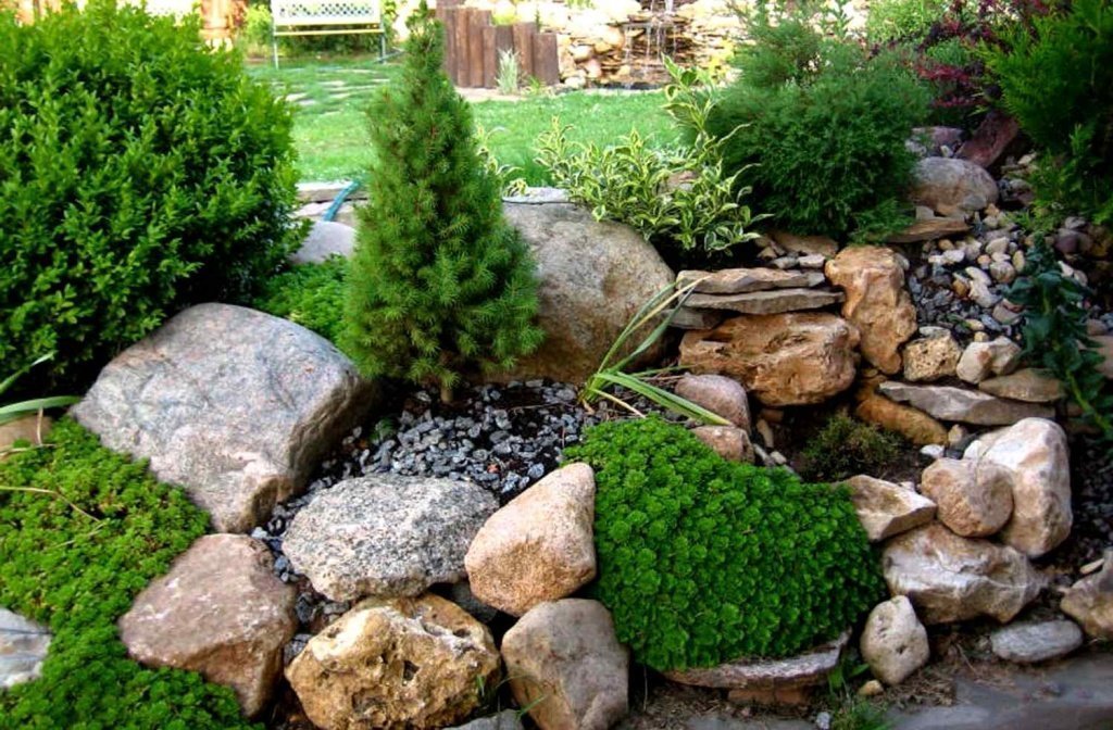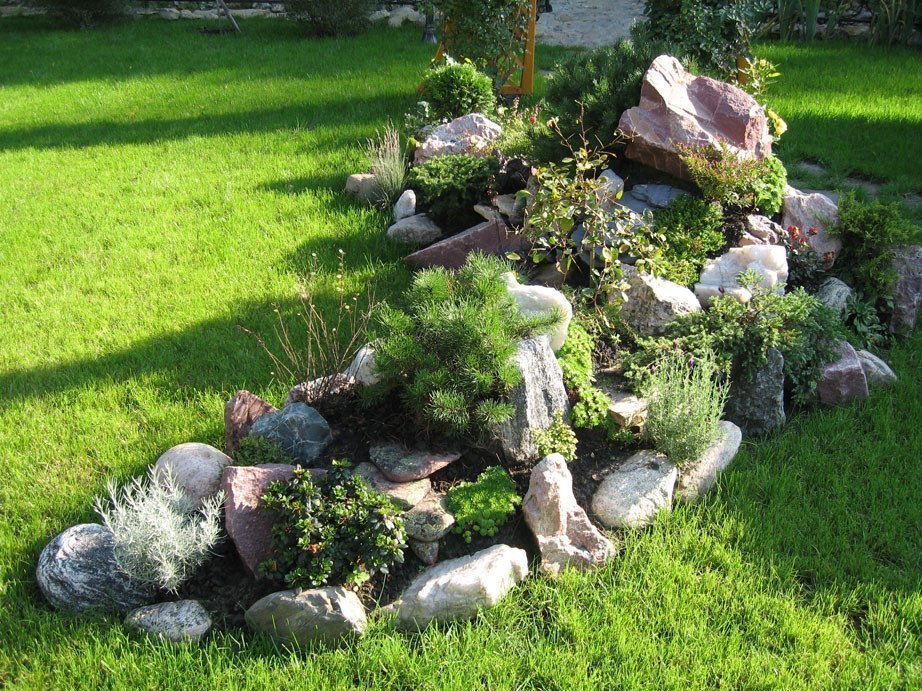 La colina alpina construida adecuadamente no es solo un vertedero de objetos necesarios y no necesarios, sino una imitación de un paisaje de montaña, con la presencia de arbustos originales, caminos bordeados de piedras. No debe haber estructuras exteriores, parques infantiles, etc. cerca del tobogán. El tobogán alpino en su tamaño se adapta orgánicamente al área total del jardín y se encuentra cerca de un depósito artificial u otra fuente de humedad.