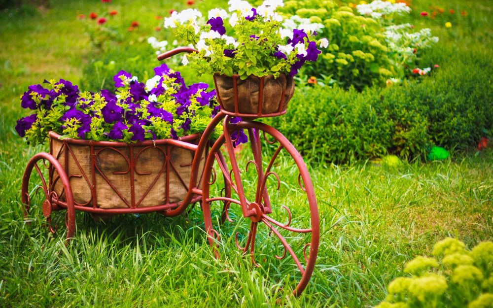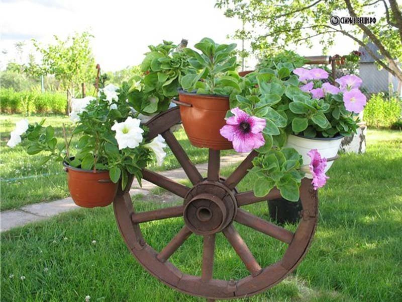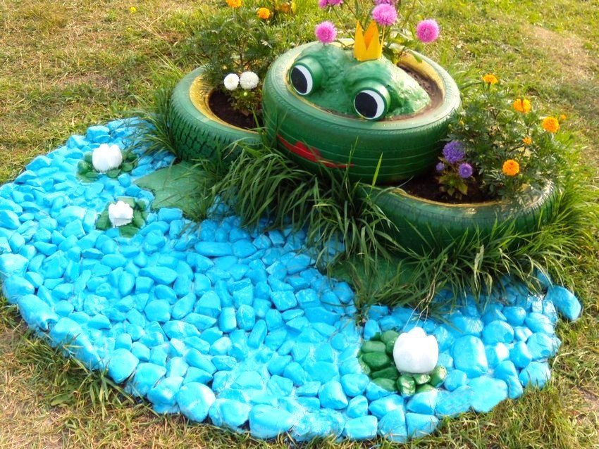 En cuanto a los accesorios para la decoración, tampoco hay límite para la imaginación. Aquellos objetos que una persona común simplemente tira en un vertedero, en manos del artista, adquieren una segunda vida. Entonces, una vieja carretilla oxidada para transportar carbón se convierte en un hermoso lecho de flores. Rastrillos viejos, helicópteros, palas: todo encuentra su lugar en el diseño. Las llantas gastadas del automóvil se trenzan con una enredadera y se convierten en la decoración principal del sitio, y la iluminación original del depósito convierte un estanque ordinario en uno fabuloso.