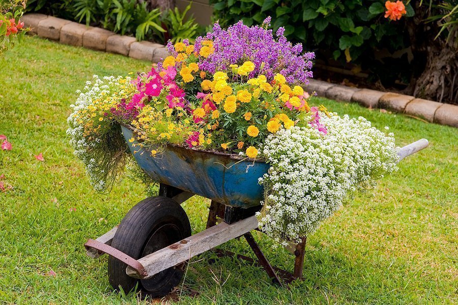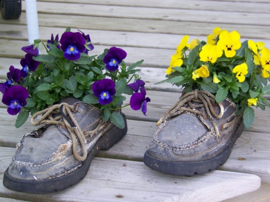 Si la casa tiene botas de goma viejas y con fugas, no se apresure a tirarlas. Píntalas en colores brillantes e inusuales, aplica una imagen, planta flores en ellas y colócalas en una cama de flores, o cuélgalas a lo largo de la cerca.Las macetas también se pueden "plantar" en muebles viejos sin asientos. En general, es fácil convertir cualquier utensilio en una cama de flores: habría un deseo y una imaginación.