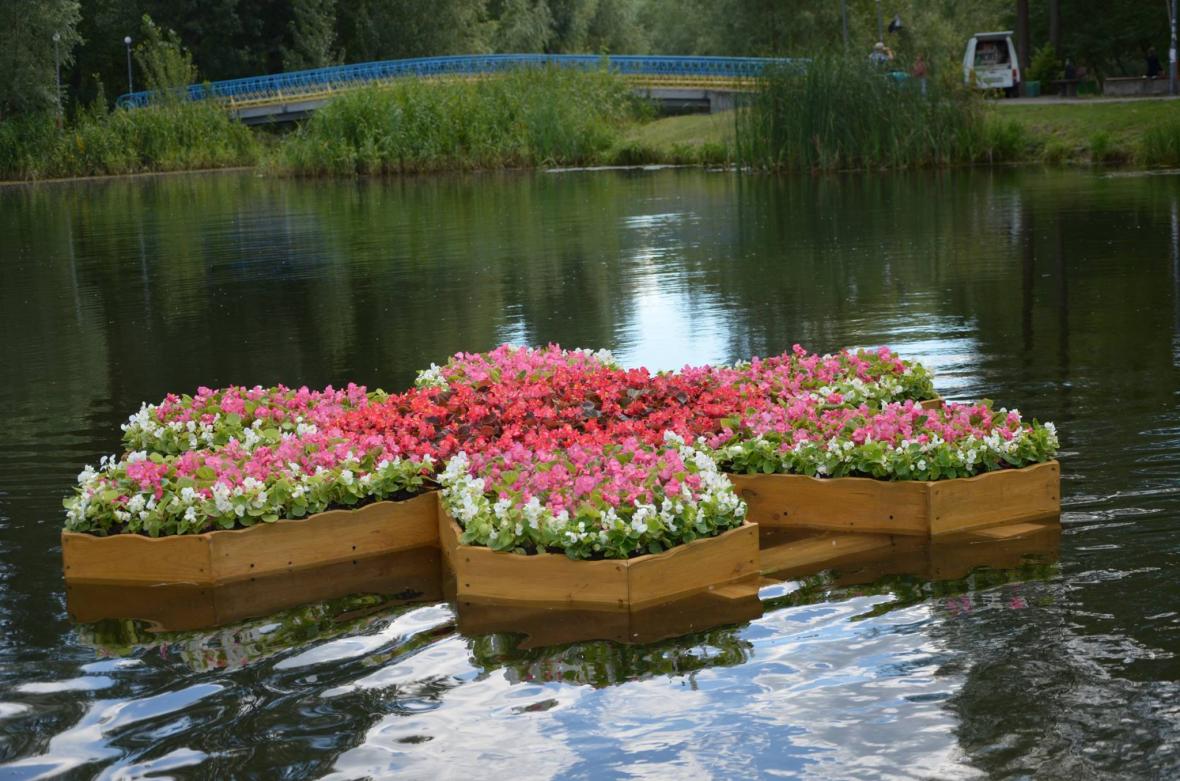 Tal elemento decorativo de un depósito como un macizo de flores flotante se ve muy elegante y hermoso. Puedes hacer una isla verde de flores tú mismo. Es suficiente hacer una base de madera sólida con impregnación resistente a la humedad, sobre la cual se colocan la rejilla de sellado y el suelo, y plantar las plantas en esta balsa.