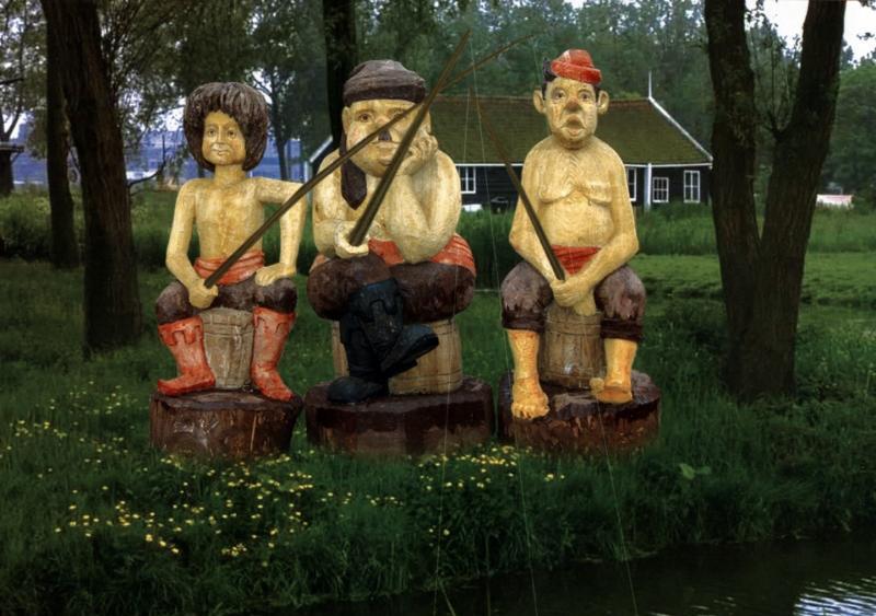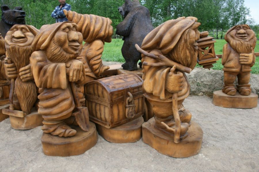 Dependiendo del estilo y los gustos personales de los propietarios, es posible utilizar figuras de madera grandes y pequeñas en el jardín: los héroes de las epopeyas antiguas, los personajes de cuentos de hadas. No es necesario pintarlos en todos los colores del arco iris, como en un jardín de infantes: las figuras hechas de madera natural pueden verse bastante terminadas y orgánicas. Puede ser un gran búho, oso, liebre, otras aves y animales.