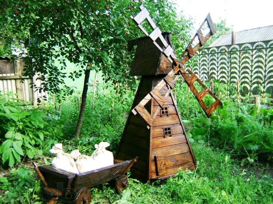 Si instala un molino decorativo de madera en el jardín, el paisaje se transformará más allá del reconocimiento. Lo principal es que todo debe corresponder al estilo general del jardín.