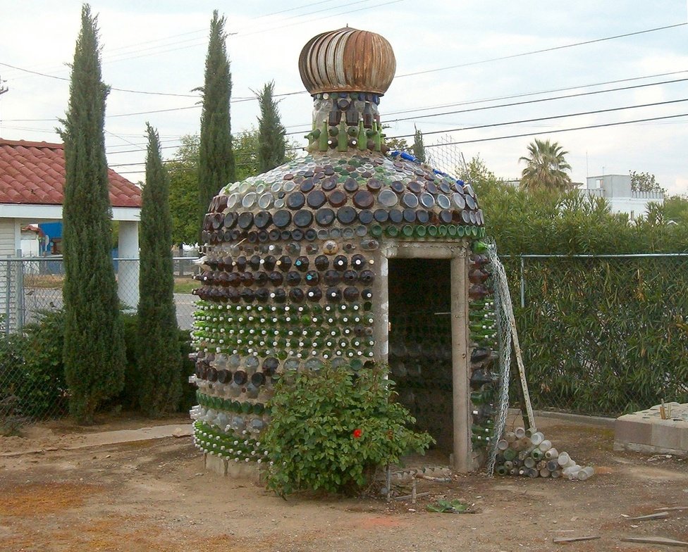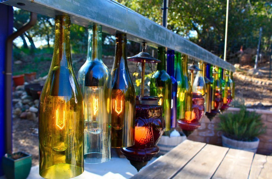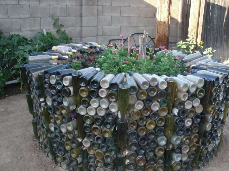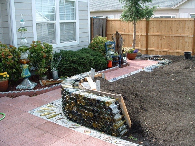 Las botellas de vidrio hacen arcos caseros ubicados en el sitio, decoran cercas con ellos y los usan como base para la fabricación de bancos originales.