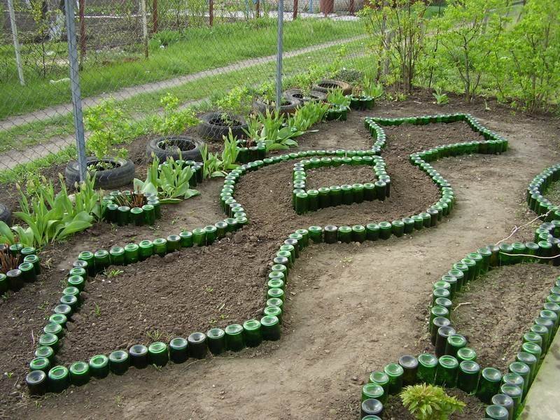 No menos interesante es la decoración del vidrio, un material más duradero y duradero. Una de las ideas para decorar el jardín de un pueblo o ciudad es recolectar una cantidad suficiente de botellas de vidrio del mismo tamaño, pintarlas del mismo color (o en tonos diferentes pero combinados armoniosamente) y pegar el cuello a ambos lados del camino forrado con piedra decorativa.