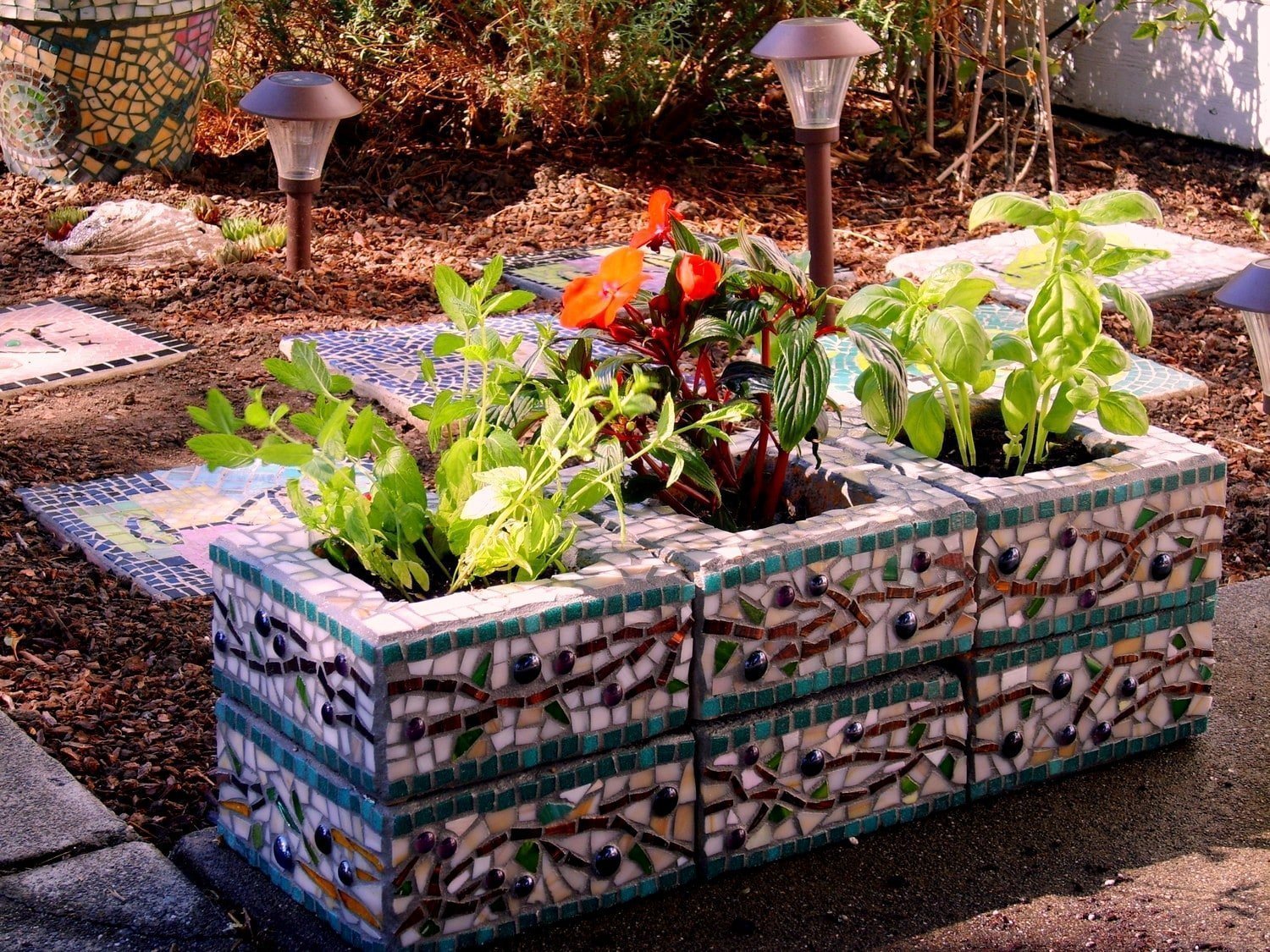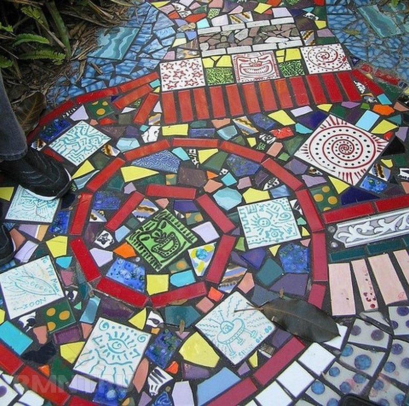 El azulejo combina maravillosamente con colores. Alrededor de los macizos de flores, simplemente puede dispersar al azar piezas de azulejos decorativos brillantes: el jardín de flores se beneficiará de esto.