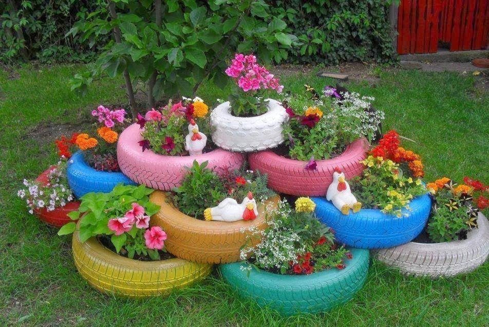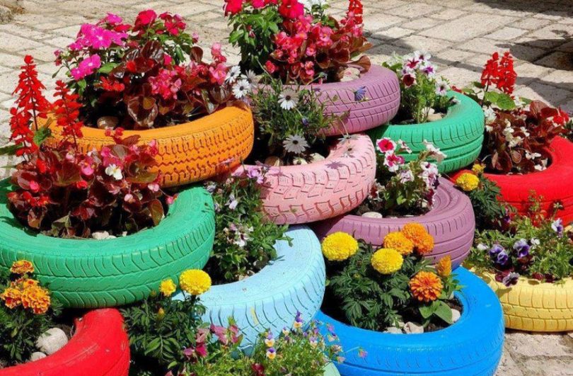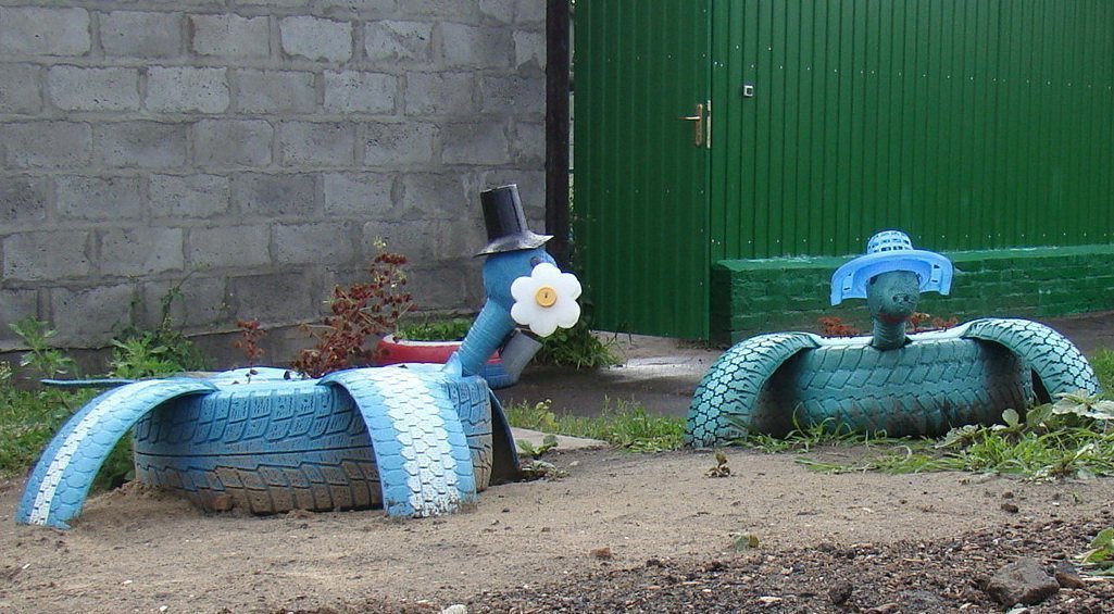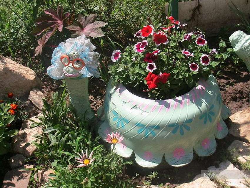 La aplicación para la decoración del jardín se puede encontrar incluso en neumáticos viejos, que son un excelente macizo de flores. Para tales fines, es mejor usar neumáticos de invierno importados desgastados: son más suaves y duraderos.
