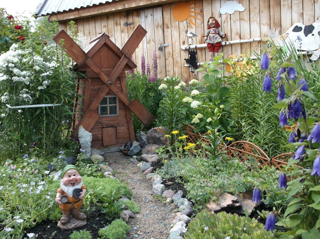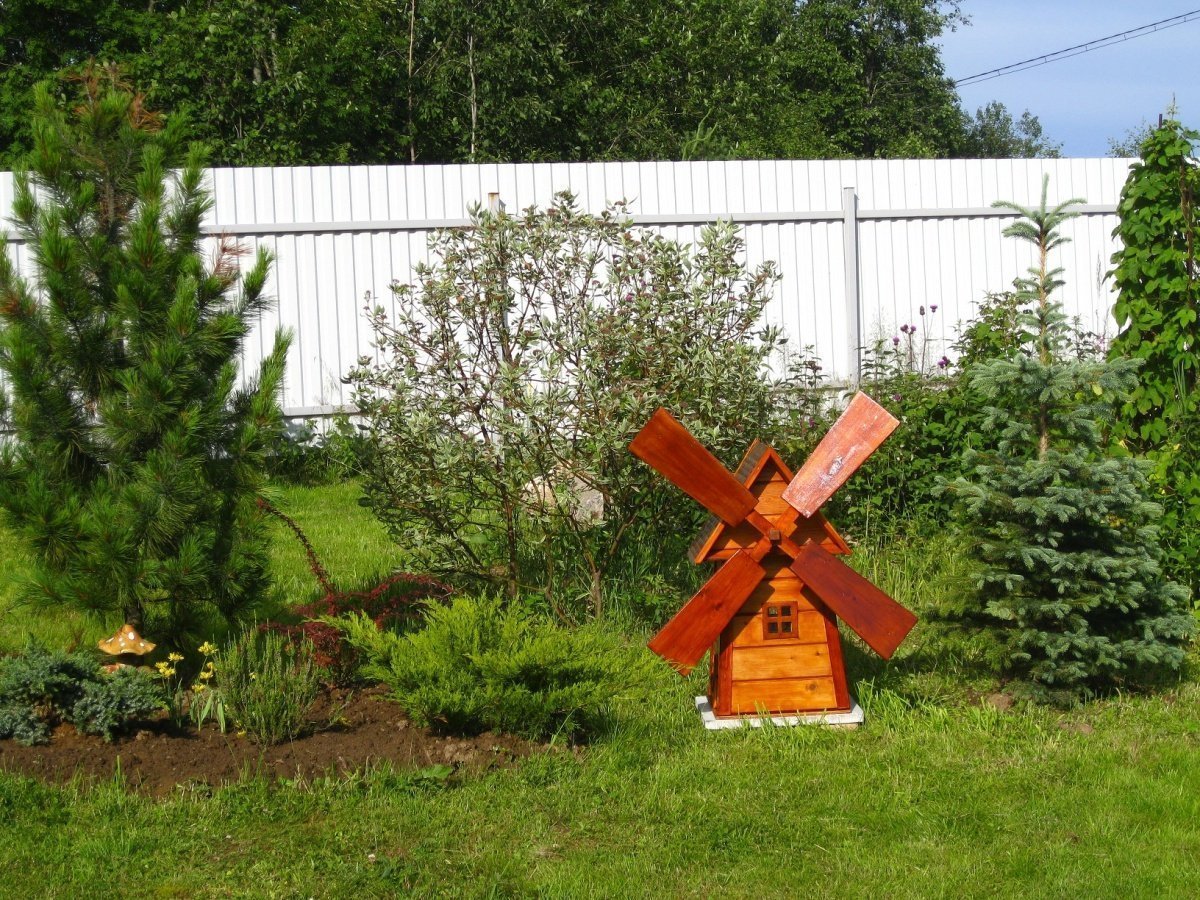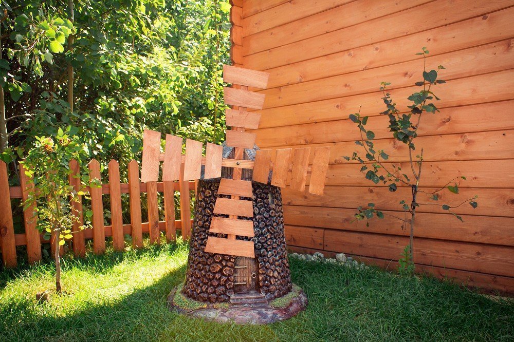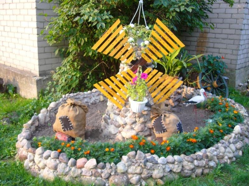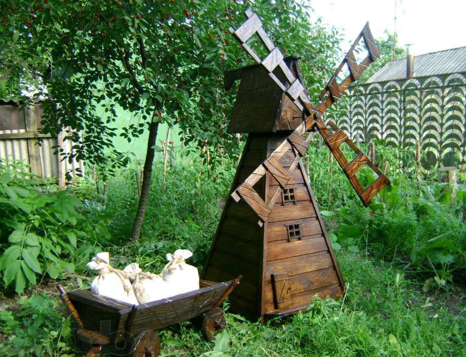 Un molino puede convertirse en el centro de una composición de parcela de jardín. Un pozo en el mismo estilo, hecho en estilo antiguo o un pajar decorativo, apoyará un tema dado. Figuras de madera de animales, arbustos y un jardín de flores complementarán la imagen.
