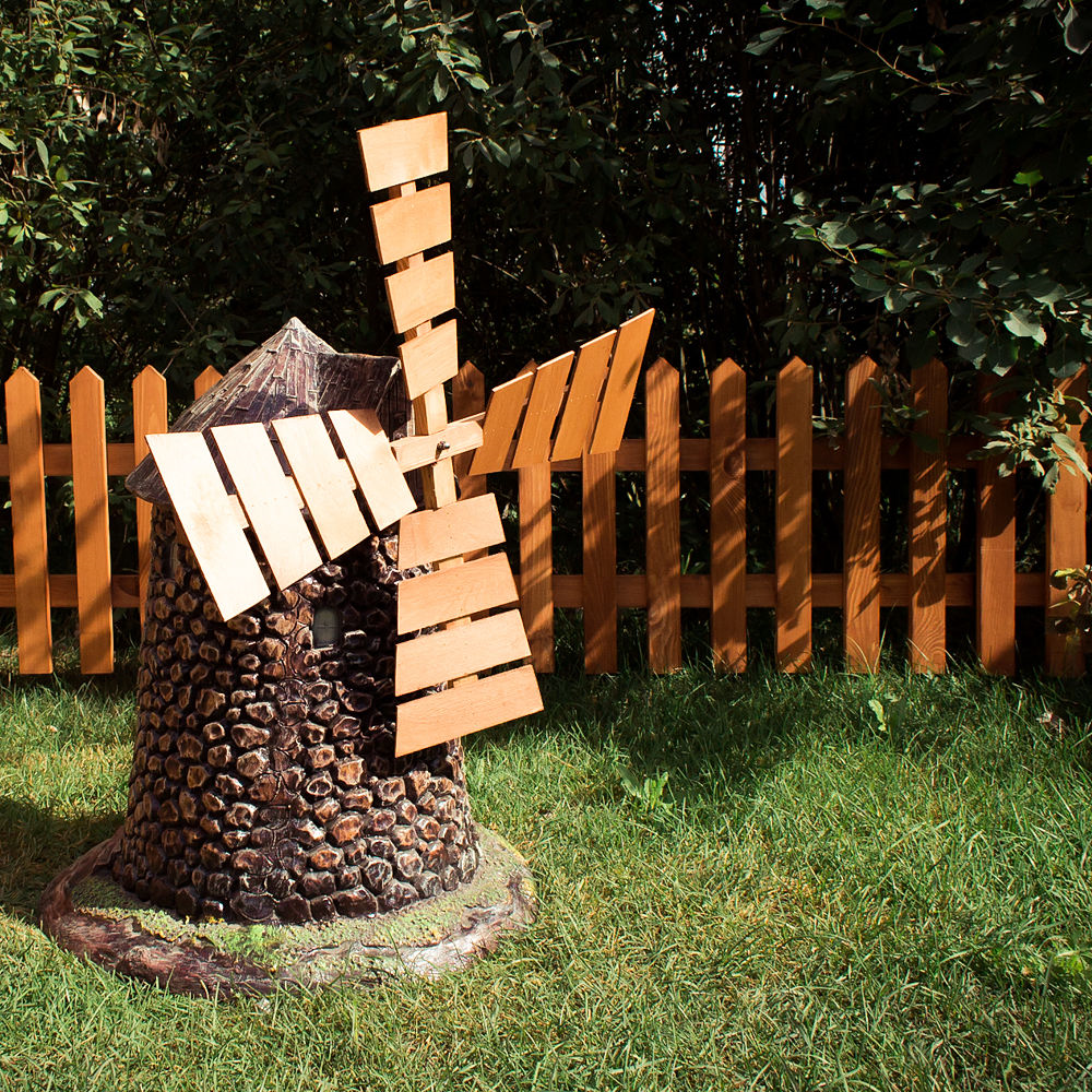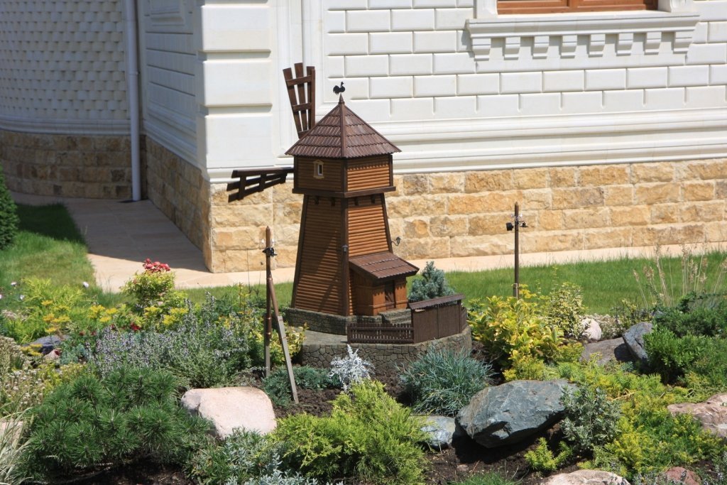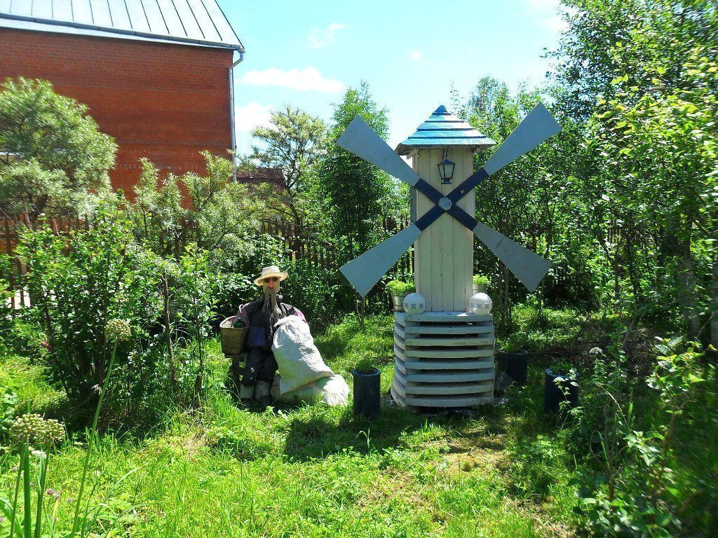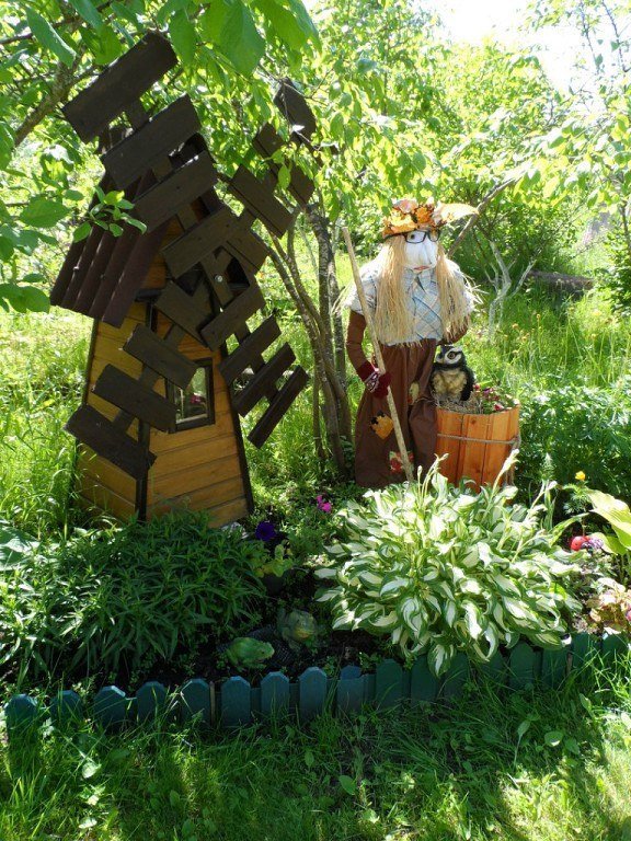 Un molino puede convertirse en el centro de una composición de parcela de jardín. Un pozo en el mismo estilo, hecho en estilo antiguo o un pajar decorativo, apoyará un tema dado. Figuras de madera de animales, arbustos y un jardín de flores complementarán la imagen.