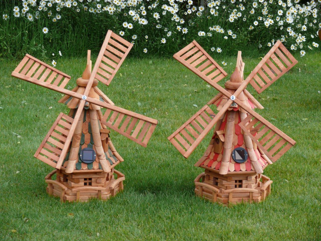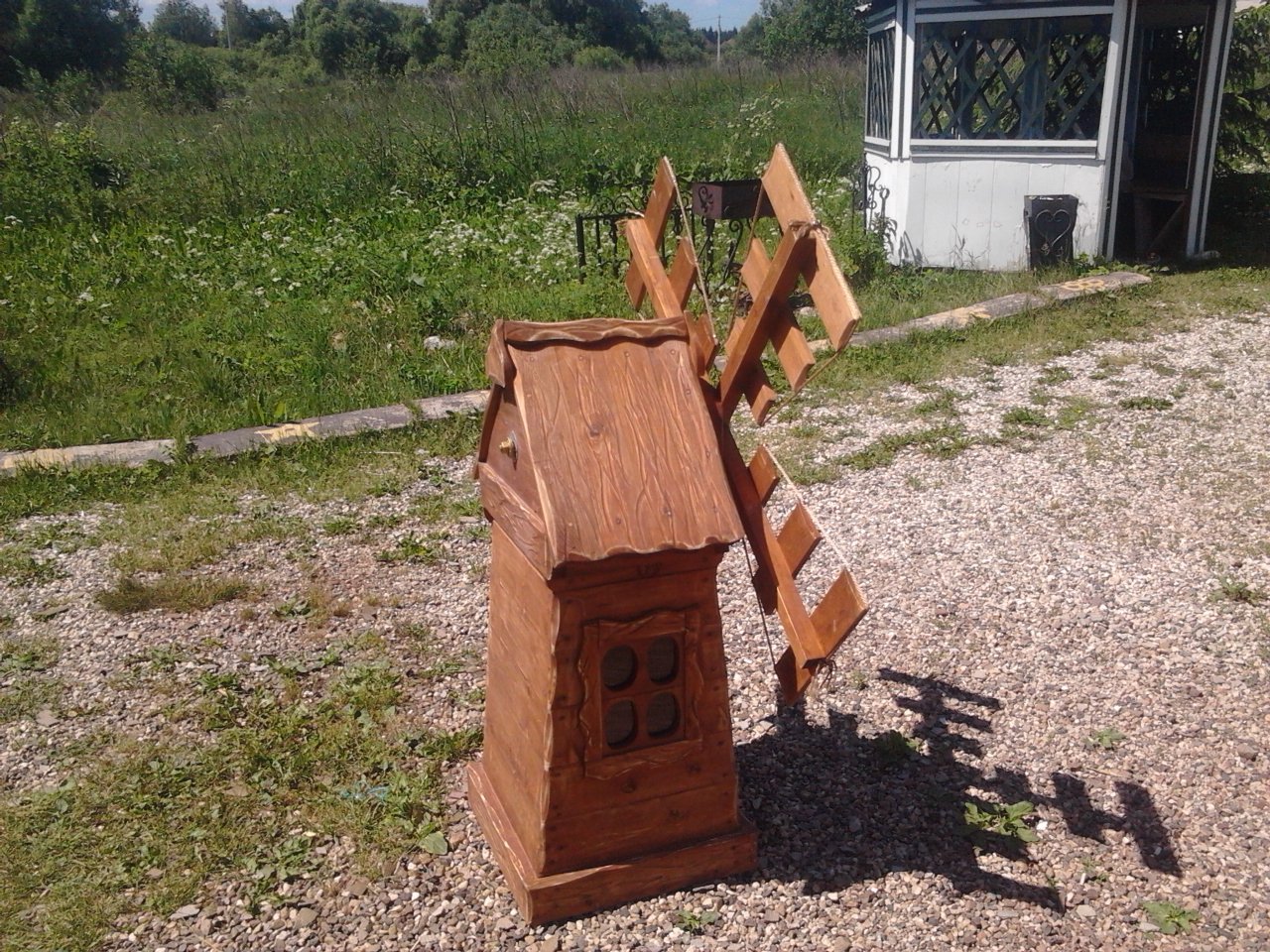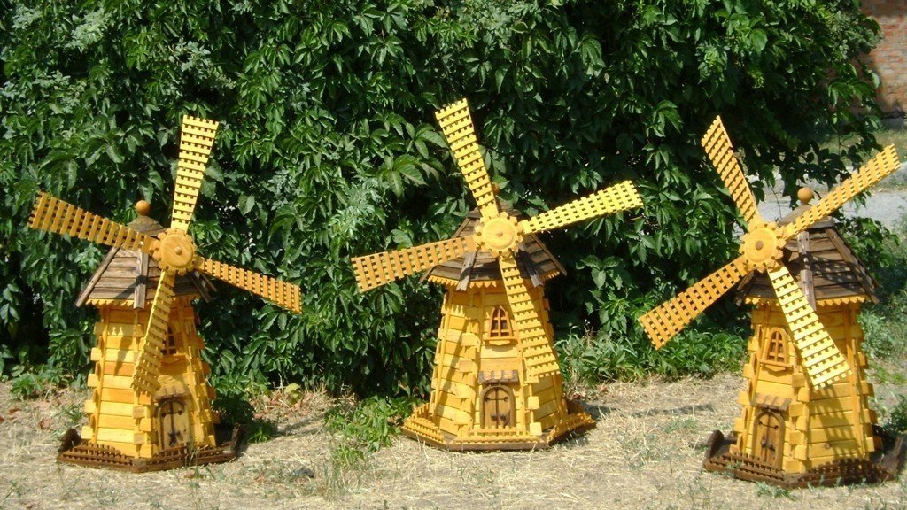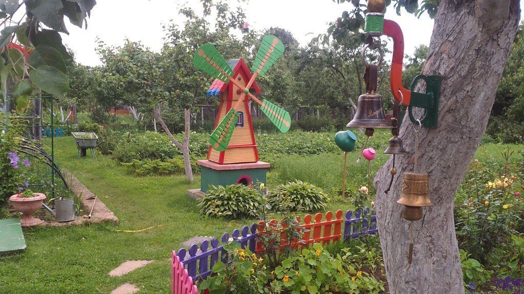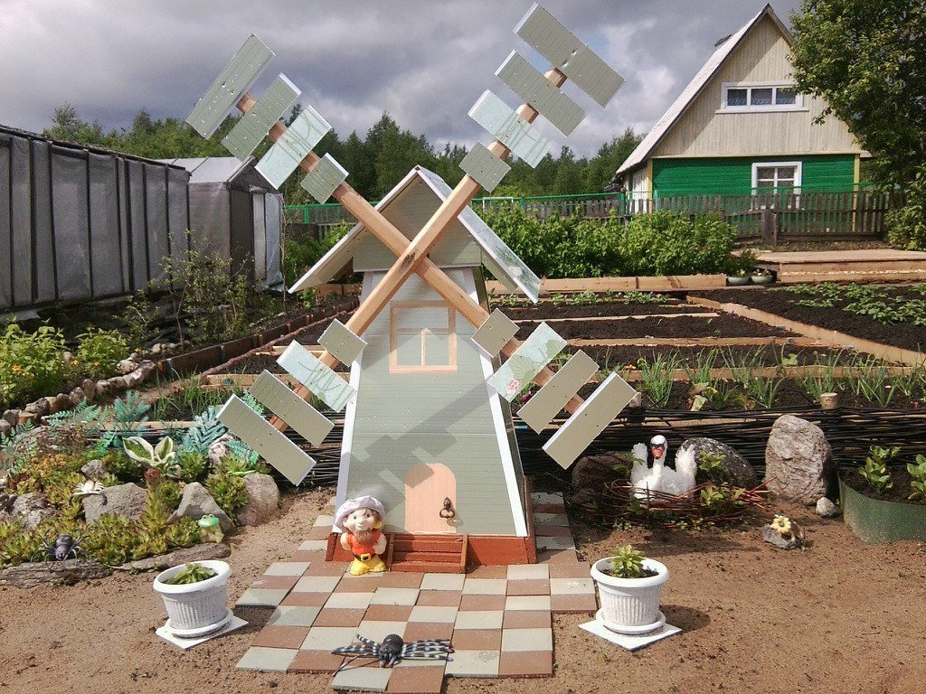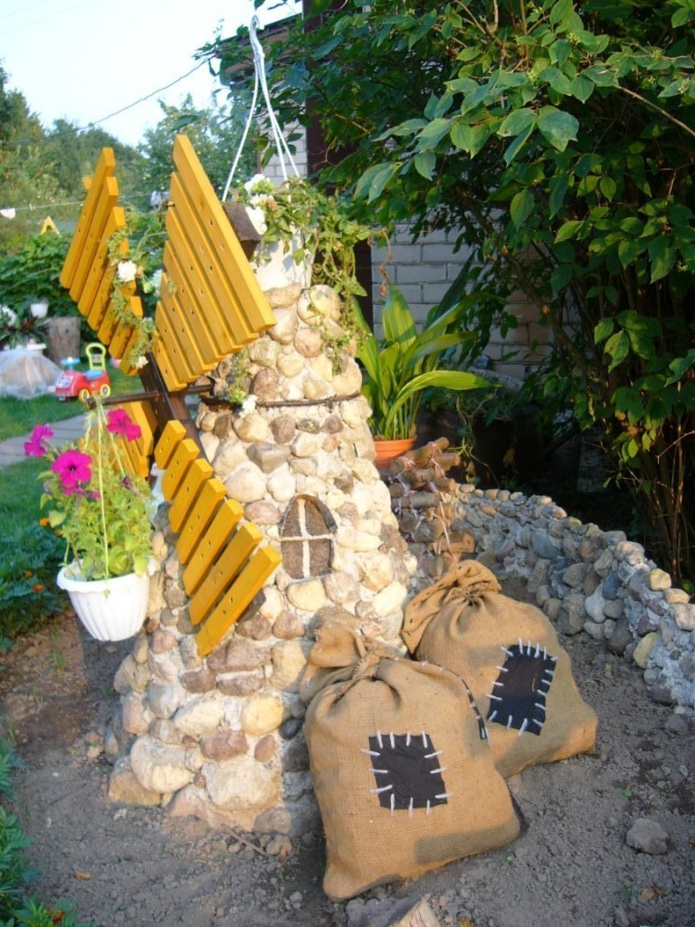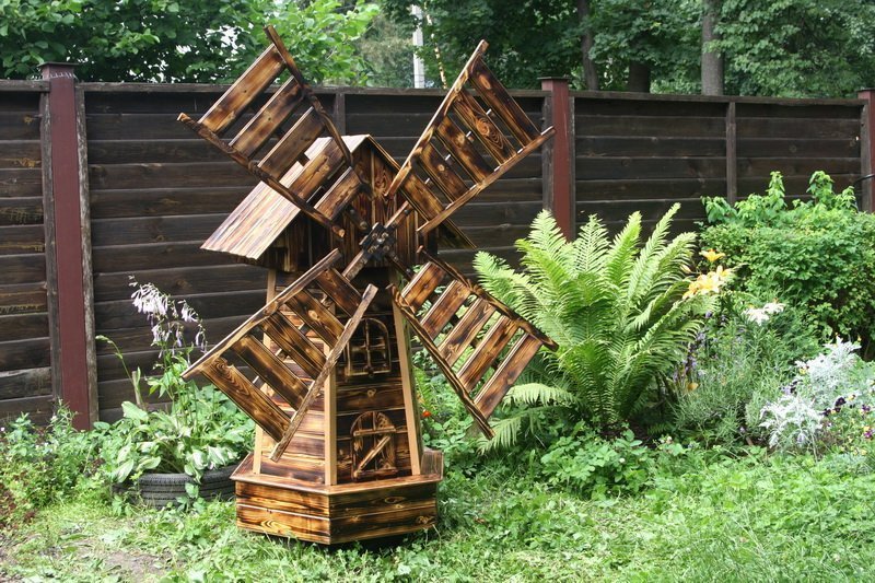 El molino decorativo en la parcela se ve original e interesante. El diseño puede ser de cualquier tamaño y forma arbitraria, hecho de madera, piedra, residuos de azulejos u otros materiales. Encajará armoniosamente en cualquier rincón del jardín. La construcción no requerirá cálculos precisos y brindará una excelente oportunidad para mostrar habilidades de diseño.