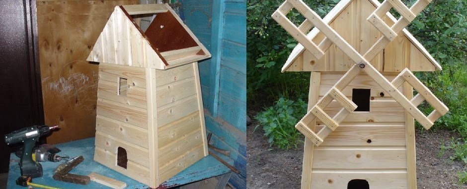 Puede hacer un molino de madera con los restos de material de construcción o comprar todo lo que necesita en la tienda. Cualquier recorte de madera maciza y madera servirá.