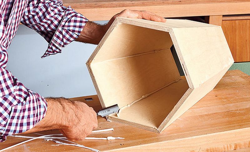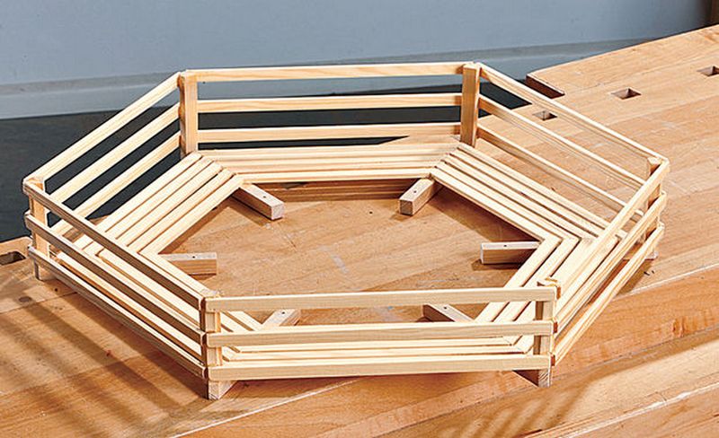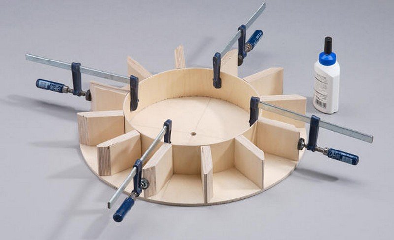 Las cuchillas a la misma distancia entre sí se sujetan entre dos círculos de madera contrachapada con pegamento o pernos.
