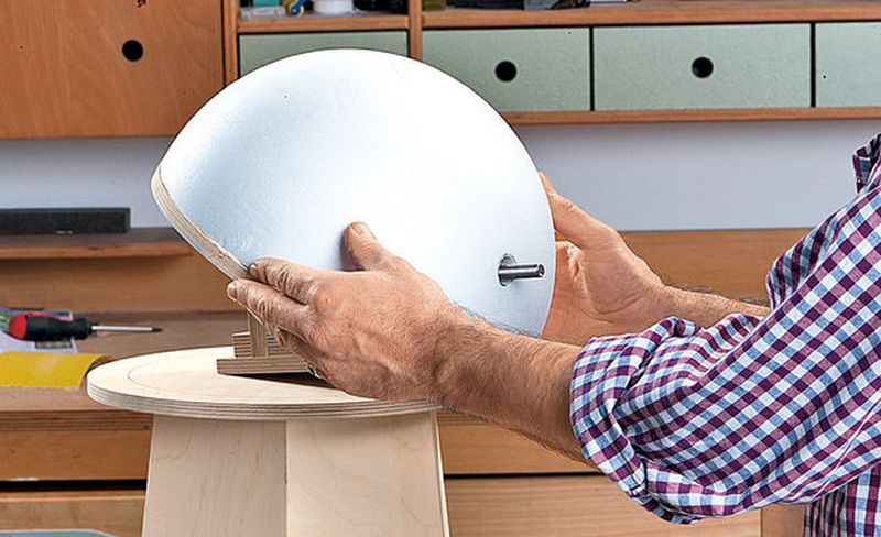 Se cortan dos círculos con un diámetro de 15-25 cm de madera contrachapada, y se hace un orificio para una horquilla en el centro con un taladro.
