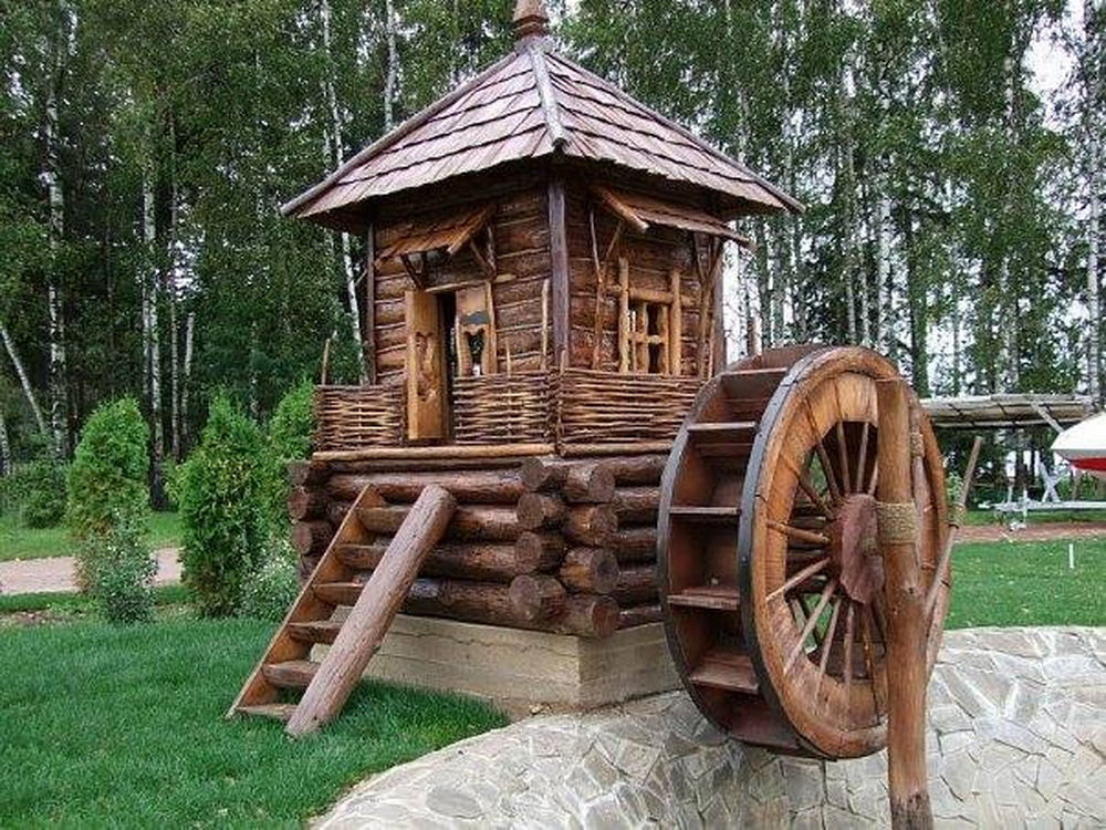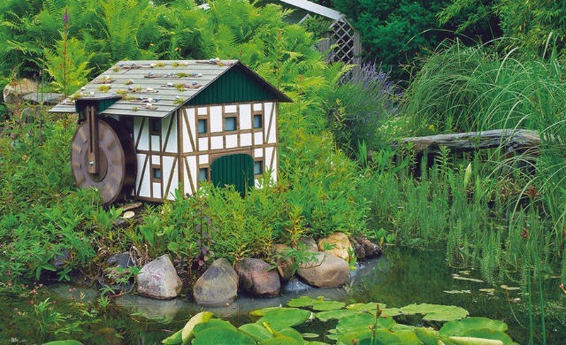 Una simple rueda de madera en la orilla de un estanque parece aburrida, por lo que la casa unida a ella se convertirá en el principal objeto de decoración.Aquí hay espacio para la imaginación: ventanas talladas con persianas, puertas, plataformas de colores. Un elemento separado de decoración en un molino de agua puede ser un techo cubierto de juncos, juncos o paja.