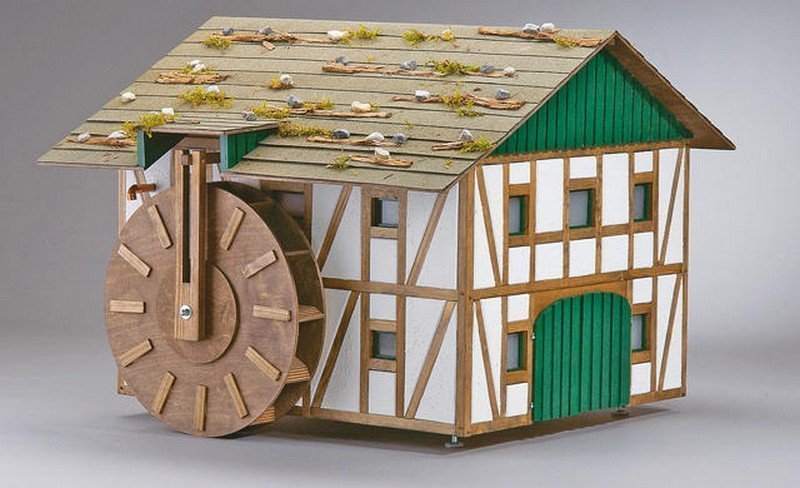 La casa del molino de agua puede estar hecha de cualquier forma y de cualquier material o ausente por completo. La construcción del edificio es estándar: la plataforma, la base de la casa y el techo.
