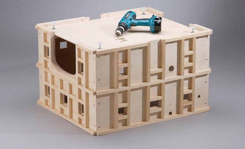 El marco del techo está ensamblado de madera y madera contrachapada. Se coloca el material del techo, después de lo cual todos los detalles de la casa se ensamblan y se sujetan con tornillos y pegamento.