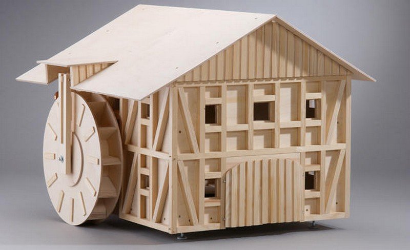La casa del molino de agua puede estar hecha de cualquier forma y de cualquier material o ausente por completo. La construcción del edificio es estándar: la plataforma, la base de la casa y el techo. Es mejor erigir un edificio en el mismo orden que en el caso de un molino de viento. Primero, se ensambla la plataforma o, si es necesario, se colocan los cimientos. Es mejor no descuidar este paso; un diseño insuficientemente fijo puede transportar el flujo de agua.