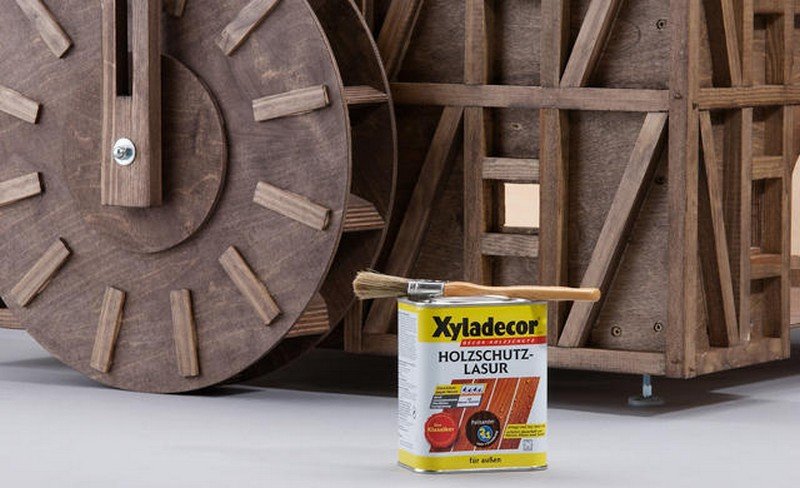 El molino terminado debe estar impregnado con una solución protectora y pintado, o recubierto con barniz o barniz. Si caminas un árbol con una mancha de madera antes de eso, puedes enfatizar la estructura del árbol. Cada capa adicional oscurecerá la superficie del molino.