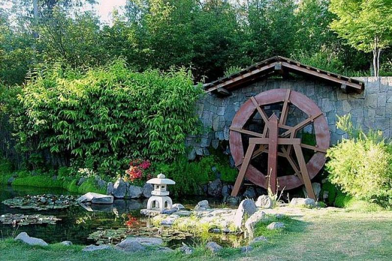 Los componentes principales son agua, piedras y plantas. No debería haber nada superfluo, porque el estilo se basa en la elegancia y el minimalismo. En un jardín japonés con un molino de agua, nada debe distraer la contemplación del elemento natural.