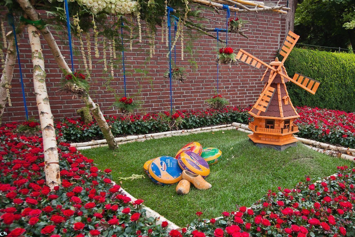 Este estilo es de gran interés para los diseñadores de paisajes, ya que combina con éxito los colores vivos y el encanto provincial. Un molino de agua puede estar en el centro de la composición; para esto, la casa debe hacerse en el estilo tradicional holandés con casas de entramado de madera, que tienen un marco en el que se encuentran fuera del edificio. Otro rasgo característico es el césped molido. Deje que tulipanes, azafranes y jacintos rodeen el molino por todos lados, y un seto se enrosca.