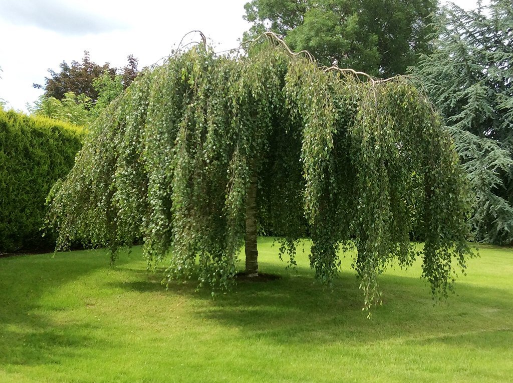abedul caído o verrugoso: tiene una altura de más de 35 m, es resistente a la sequía, crece bien en lugares soleados y húmedos. Forma llorosa de Crohn, calado, follaje en verano verde, amarillo en otoño.