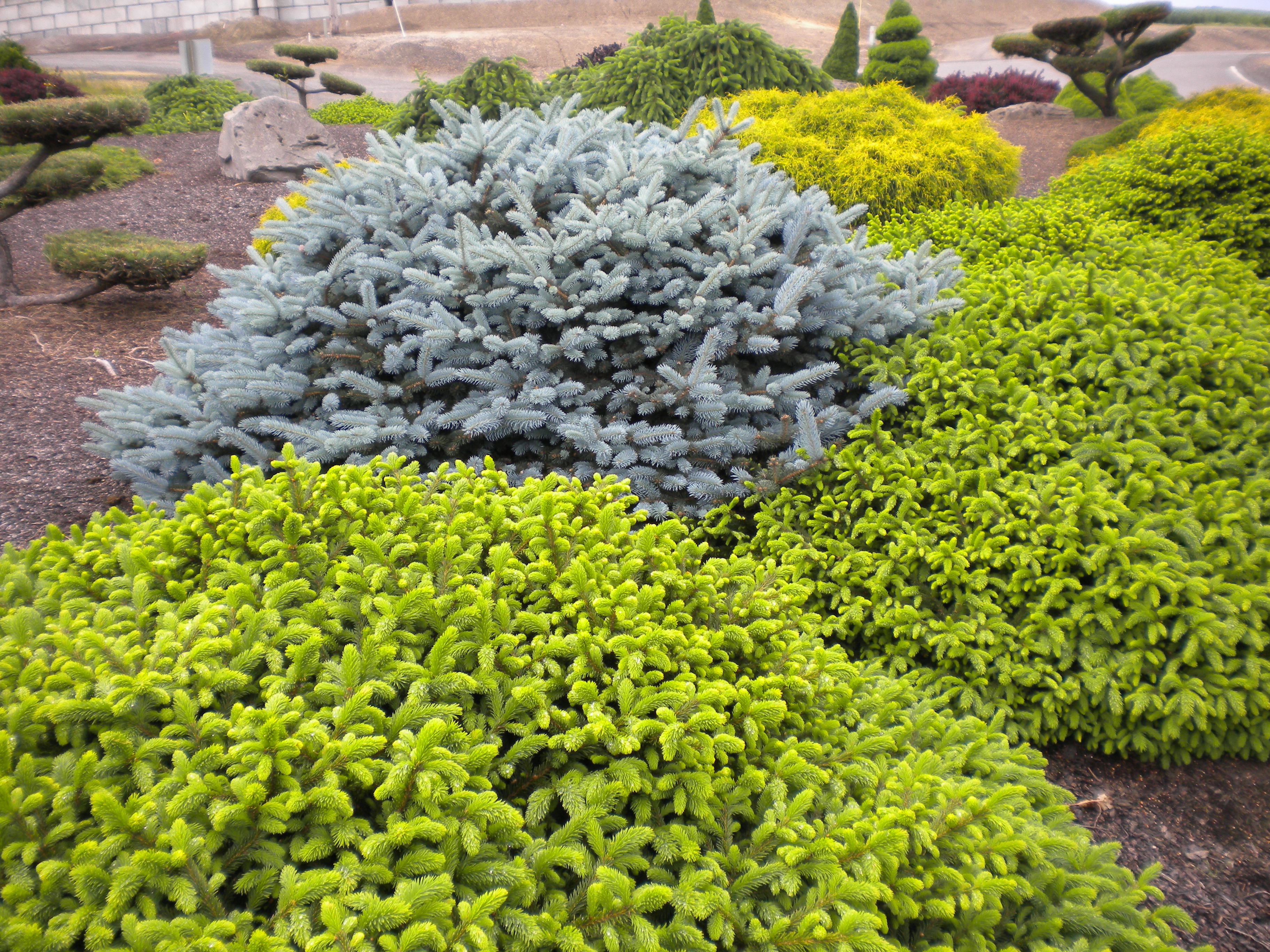 pino: crece bien en áreas soleadas y arenosas, no tolera el encharcamiento excesivo. Ocurre razas ordinarias y enanas. Una variedad popular es el pino de montaña con agujas de color verde amarillento; en diez años no crece más de medio metro, pasa el invierno perfectamente bajo la nieve;