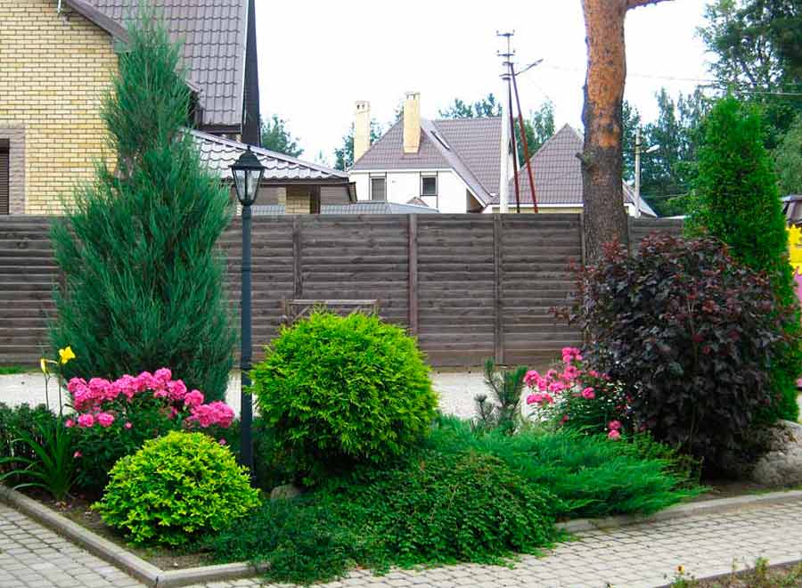 Las composiciones de tales plantas son una de las más ventajosas y atractivas para el exterior. Una variedad de arbustos coníferos le permite crear composiciones interesantes con elementos de diferentes formas y tamaños. Los macizos de flores de hoja perenne purifican el aire, decoran el sitio. Las agujas resistentes y fragantes se sienten muy bien en el jardín. El color verde saturado proporciona atractivo durante todo el año. En lugar de agujas caídas, una nueva crece imperceptiblemente.