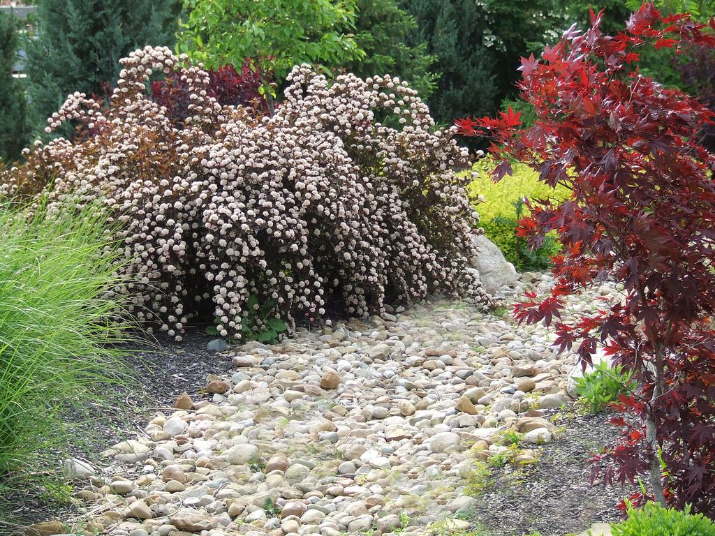 Gran decoración para el jardín. Algunas de sus especies están sujetas a protección en áreas protegidas. El arbusto ornamental crece en altura no más de 3 metros, en ancho puede crecer hasta 4 metros. Las hojas son grandes, de textura que recuerda al pie de gato. Gracias a la exuberante corona de varios tonos, la planta no pierde su efecto decorativo, apariencia efectiva durante toda la temporada de crecimiento. Las inflorescencias corymbose convexas aparecen en junio y permanecen durante 3 semanas.