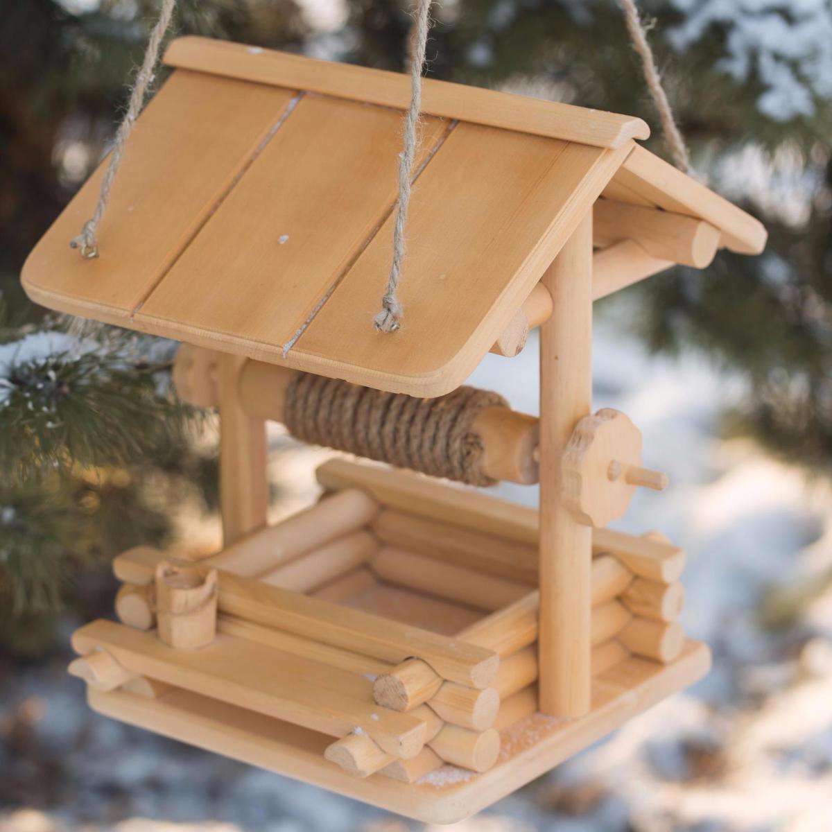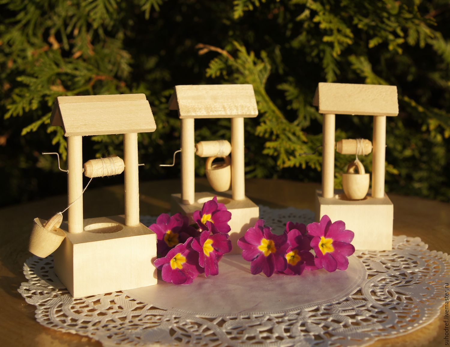 Una plataforma es una viga redonda que se monta en bastidores con pasadores de madera. Un cubo está hecho de varios dados de la misma forma y tamaño. Sus extremos están tratados con pegamento, dispuestos horizontalmente, "boca arriba". Para que no haya turnos, puede arreglarlo con cinta adhesiva. A continuación, la pieza de trabajo se retuerce con un cilindro, dejando que se agarrote. Corte la parte inferior correspondiente al diámetro interno del anillo, taladre agujeros para los sujetadores. El recipiente resultante se puede juntar más mediante dos tiras de estaño. El cubo está ensamblado: en lugar de asas, habrá un cordón decorativo, una hermosa cadena. Cómo se ven individualmente la plataforma y el cucharón, vea la imagen a continuación. Ahora el diseño está ensamblado, se puede pintar en cualquier color, barnizado.