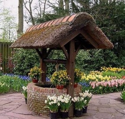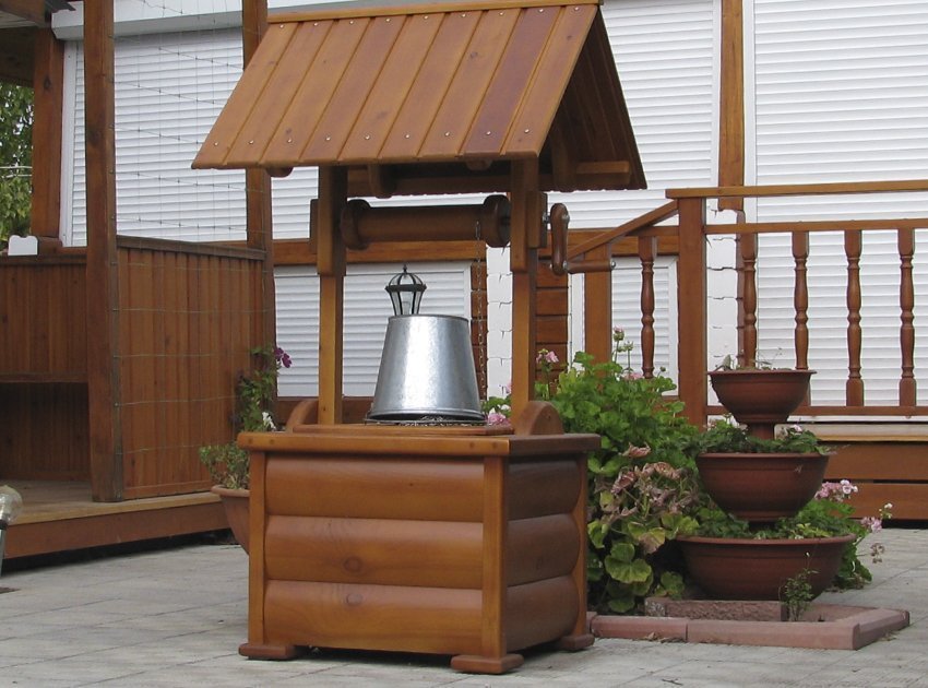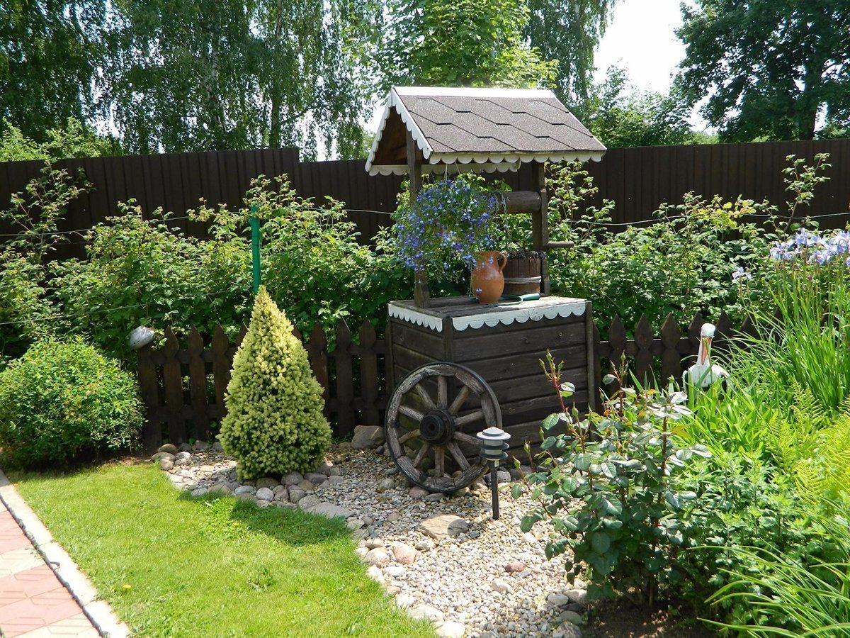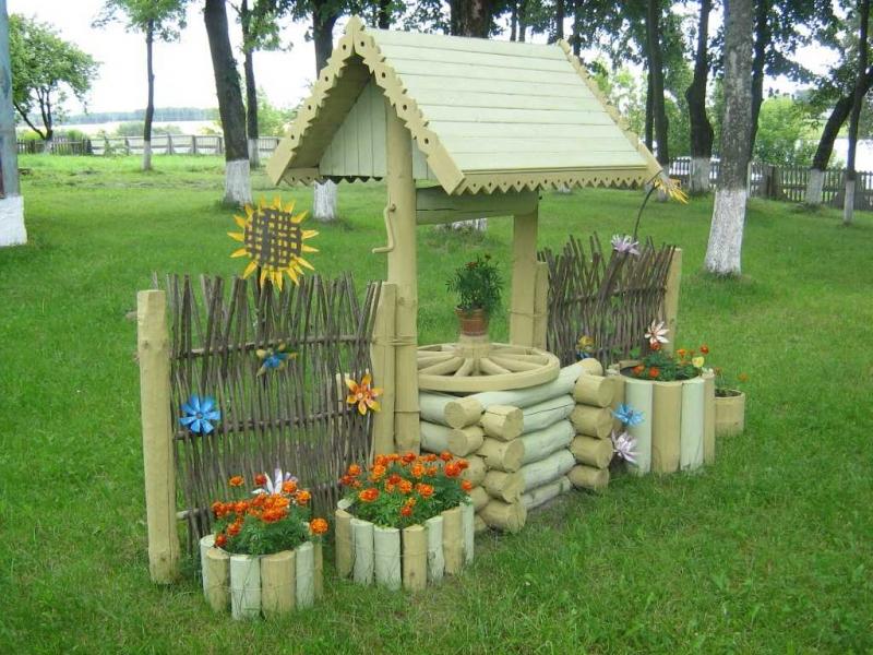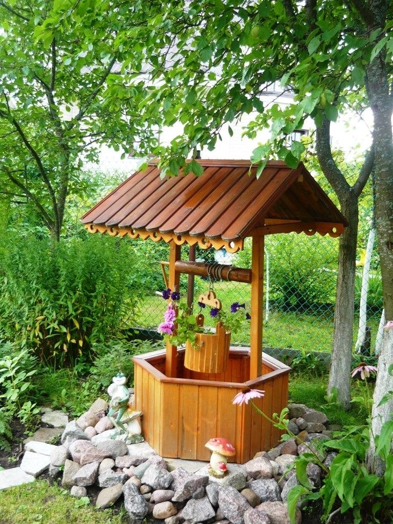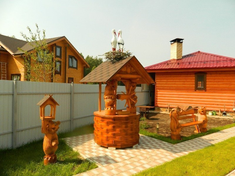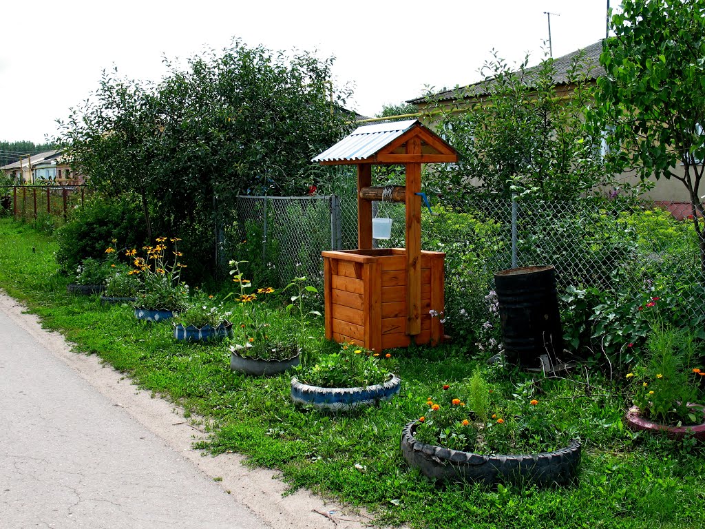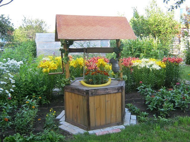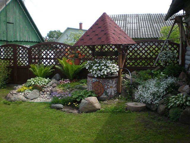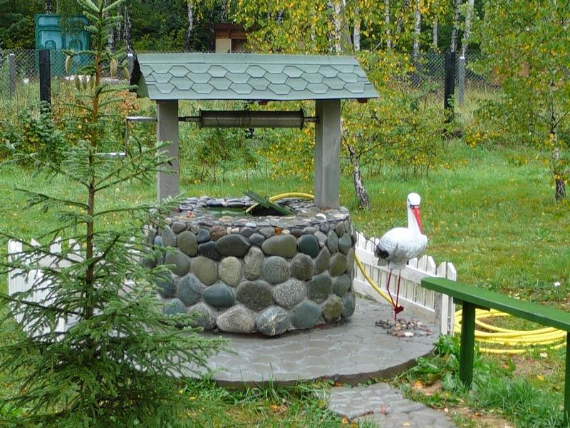 El espacio alrededor del pozo está hecho de losas, guijarros, decorados con plantas en macetas, esculturas de yeso, "gnomos de jardín" tallados.
