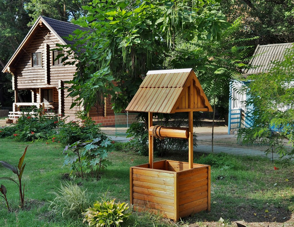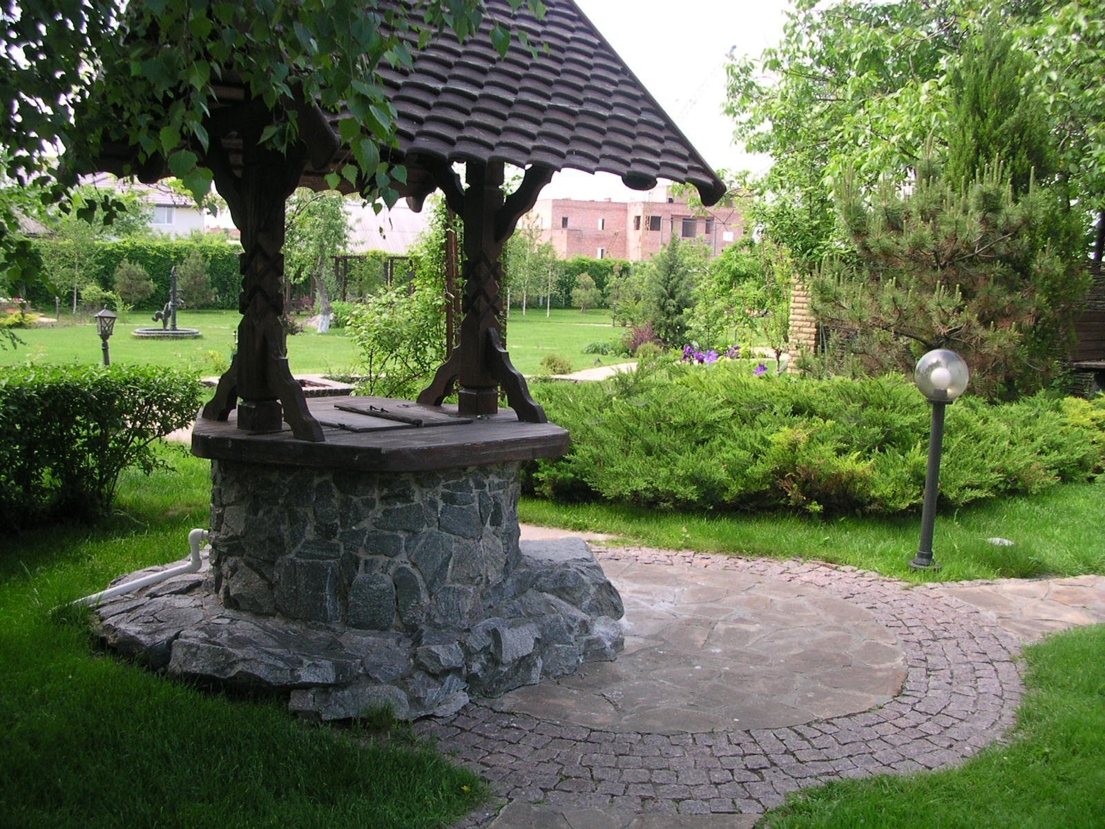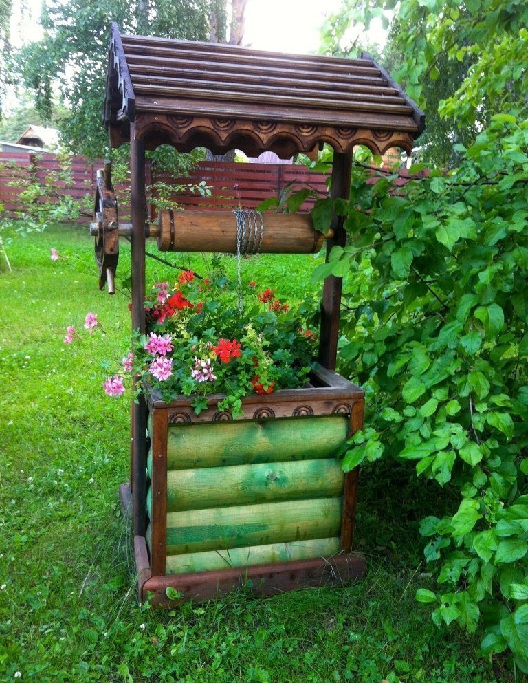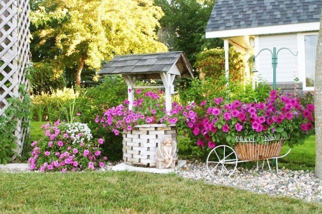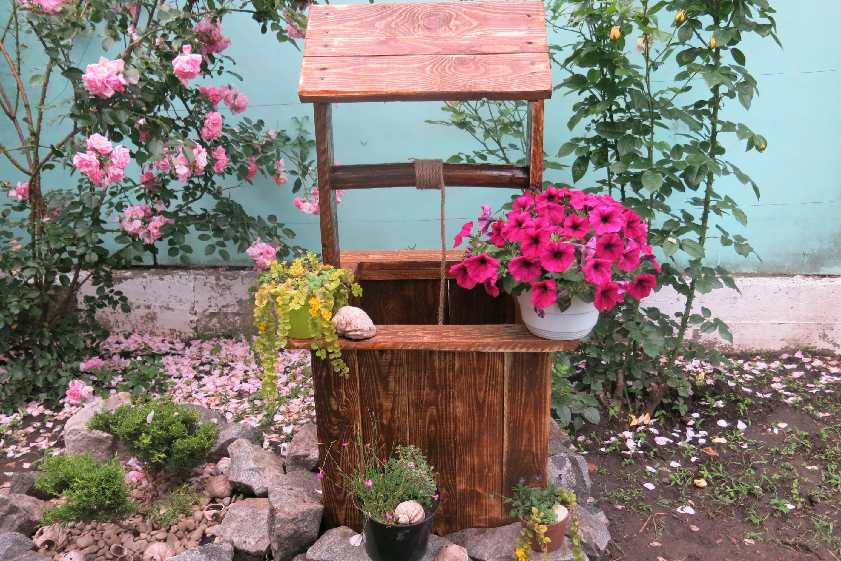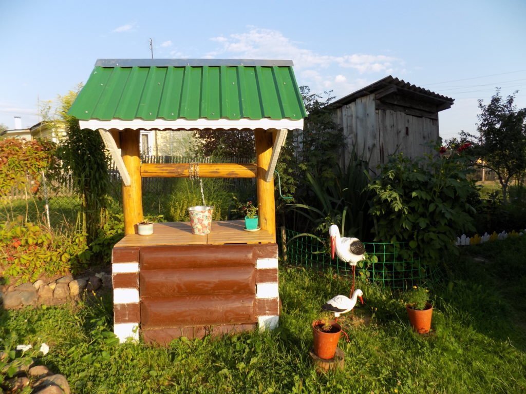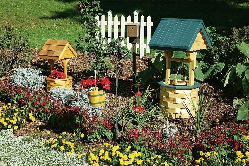 El espacio alrededor del pozo está hecho de losas, guijarros, decorados con plantas en macetas, esculturas de yeso, "gnomos de jardín" tallados.